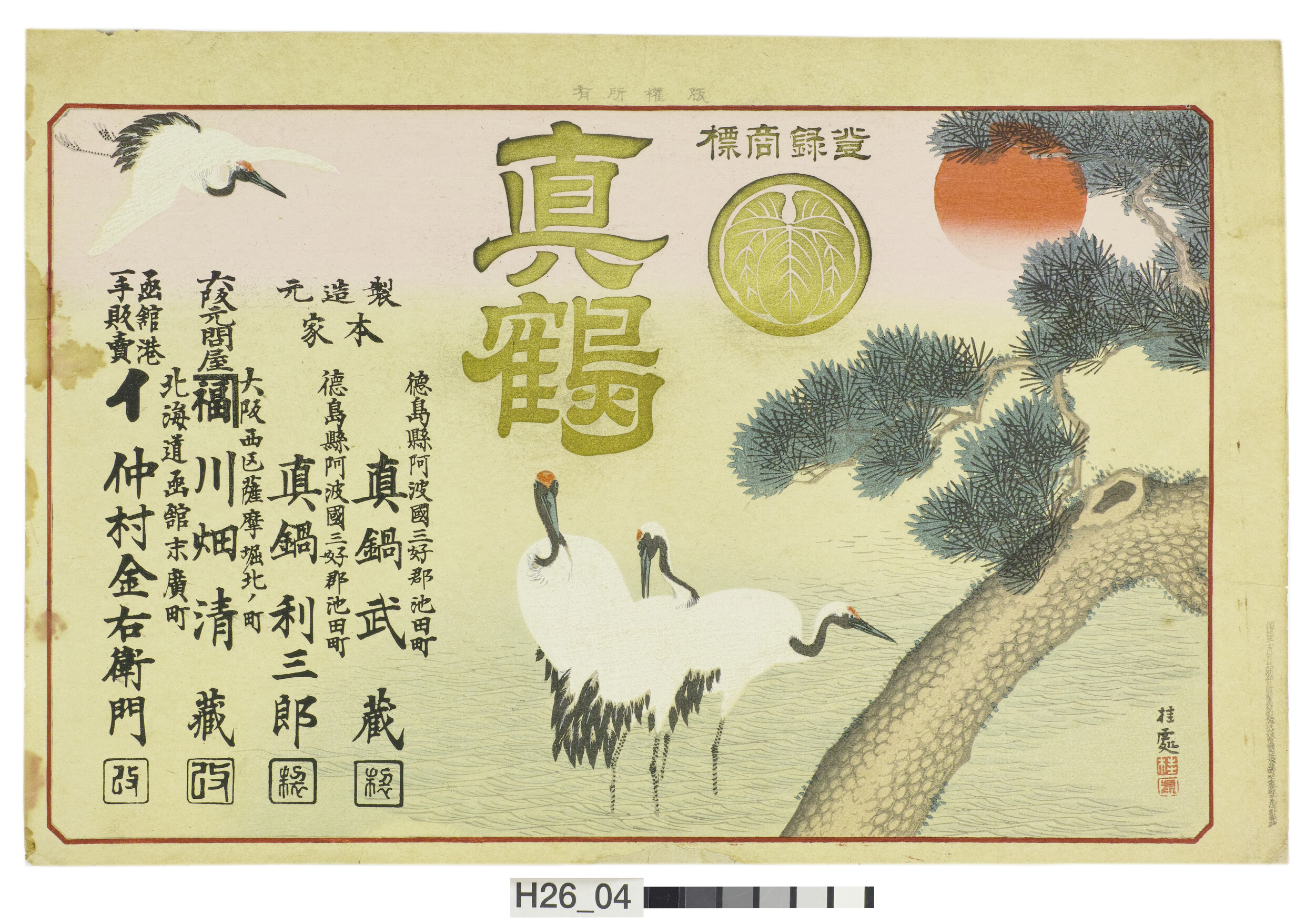 引札絵柄:松 鶴 朝日 商店場所:徳島県阿波国三好郡池田町 商店名称:製造元本家 真鍋武蔵 真鍋利三郎 商売内容:真鶴