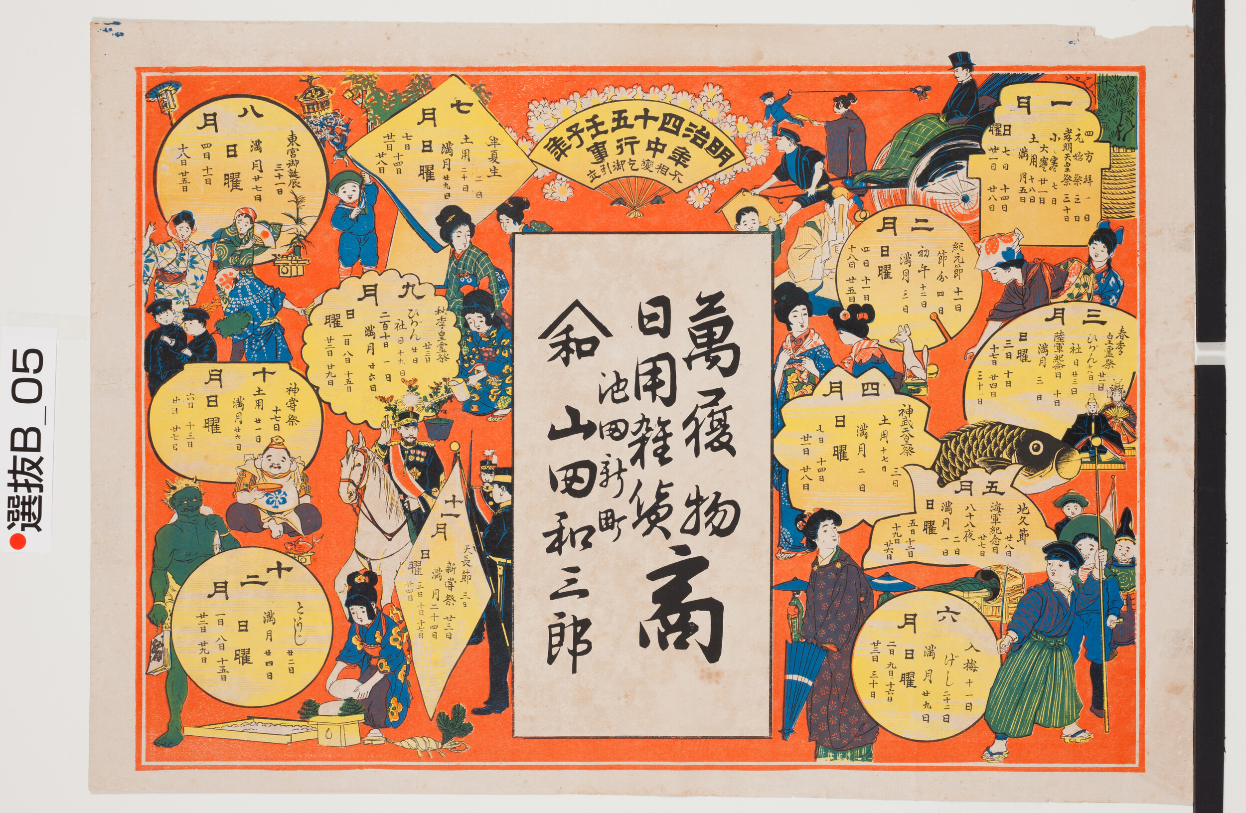 引札絵柄:明治45年壬子年年中行事 商店場所:池田新町 商店名称:山田和三郎 商売内容:萬履物日用雑貨商