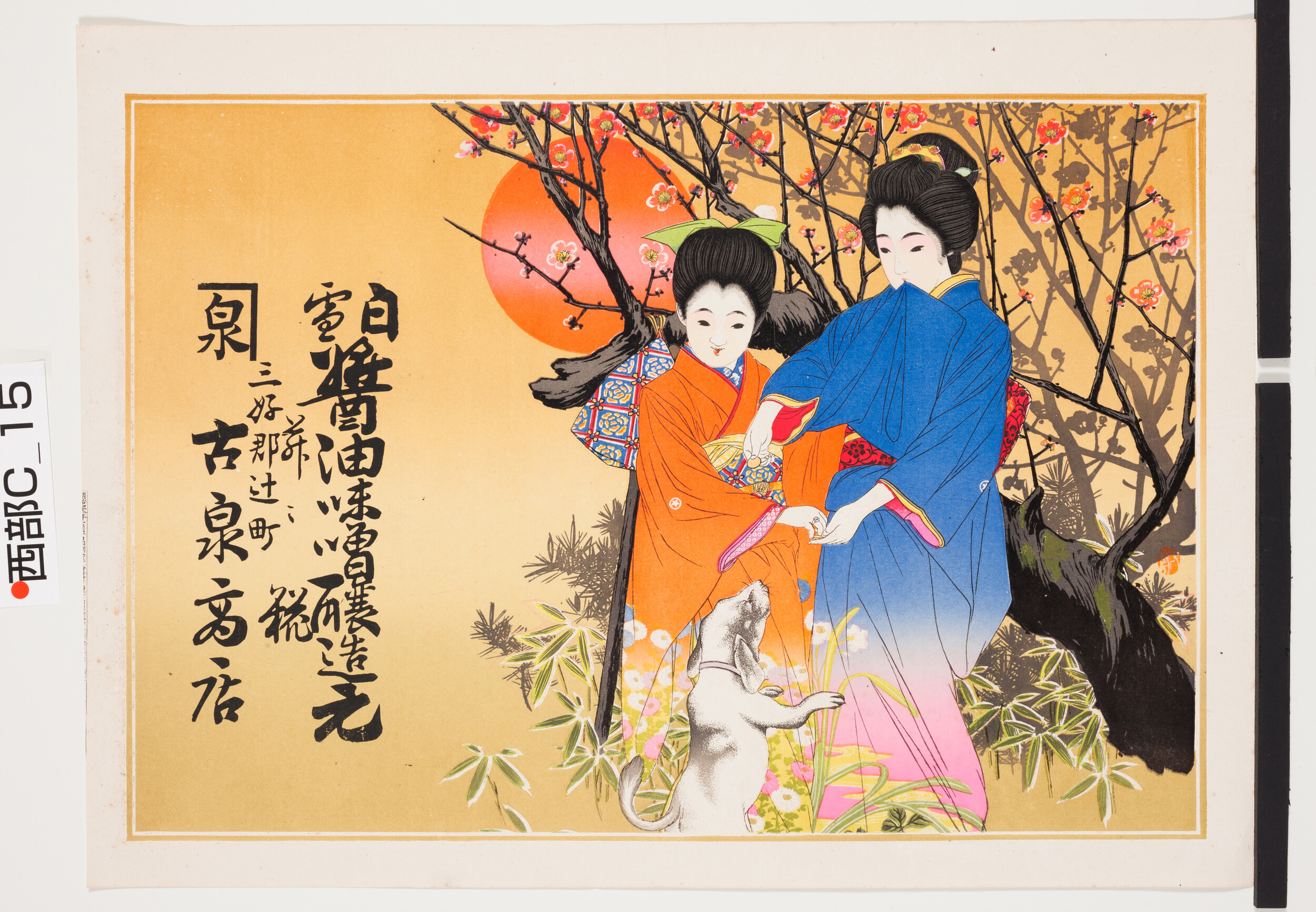 引札絵柄:紅梅満開の下で犬と戯れる母と娘 商店場所:三好郡辻町 商店名称:古泉商店 商売内容:白雪醤油味噌醸造元并ニ糀