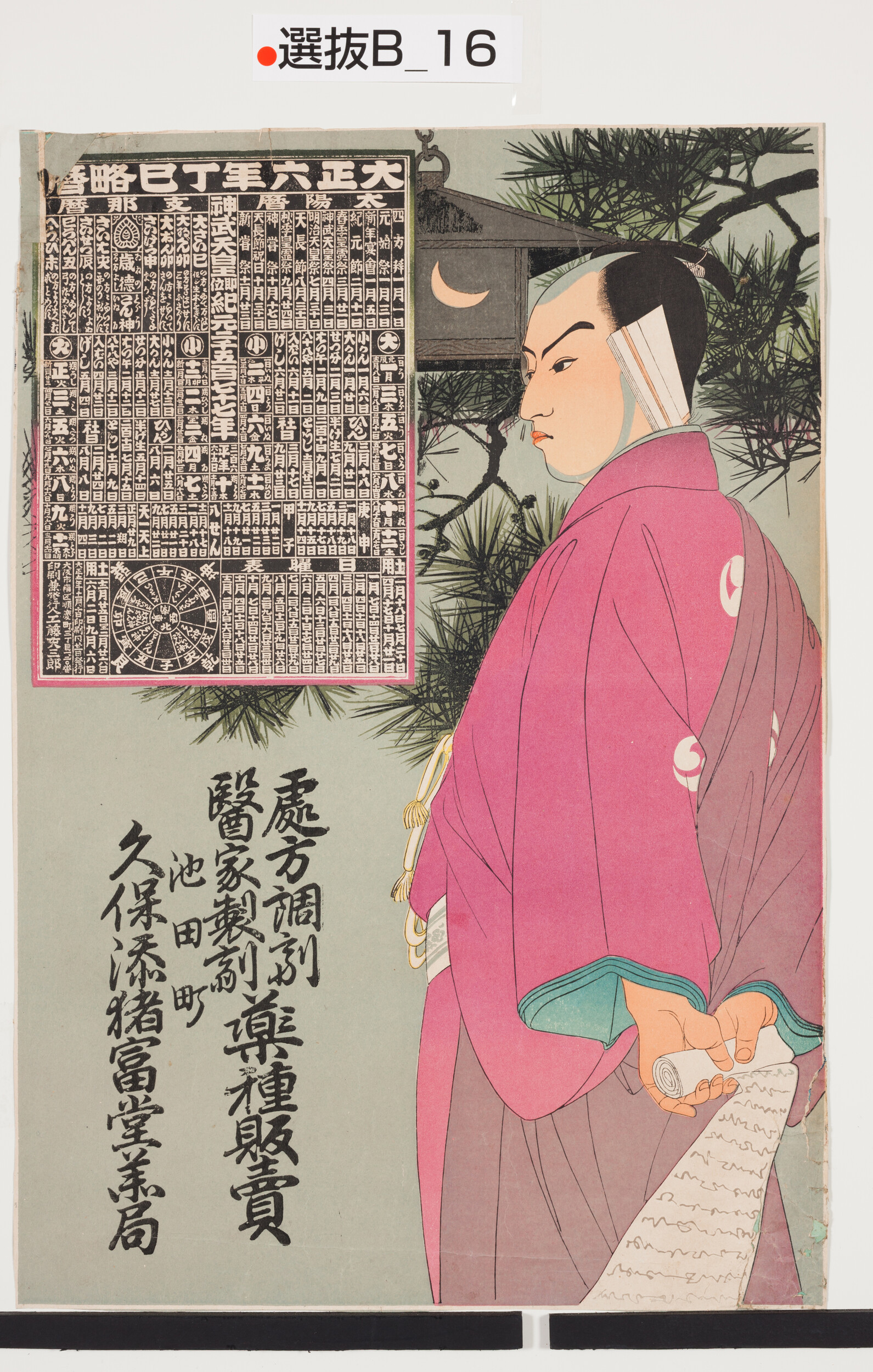 引札絵柄:大正6年丁巳略暦 大石内蔵助か 商店場所:池田町 商店名称:久保添猪富堂薬局 商売内容:処方調剤医家製剤薬種販売