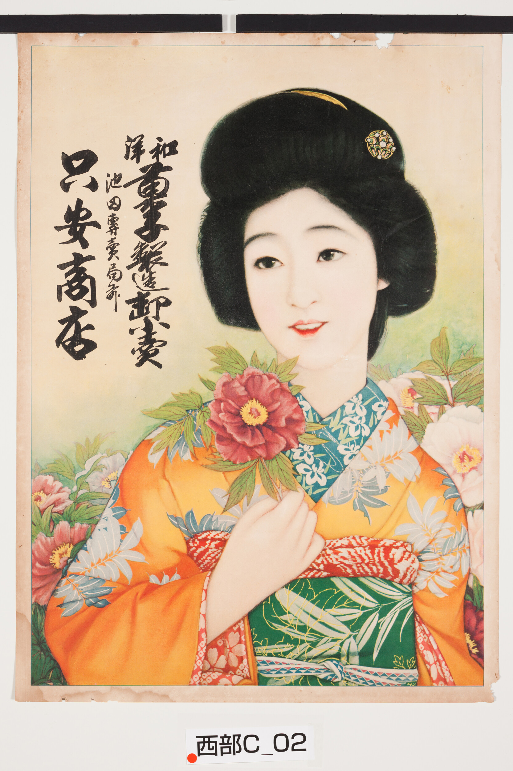 引札絵柄:美人画 商店場所:池田専売局前 商店名称:只安商店 商売内容:和洋菓子製造卸小売