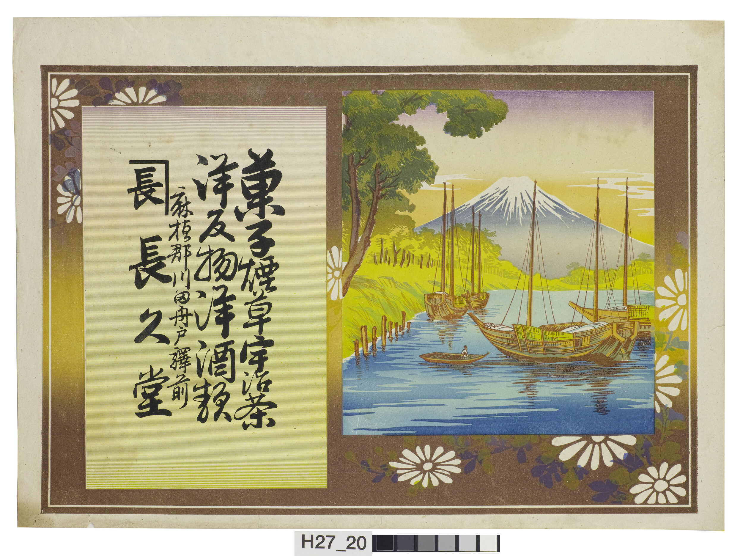 引札絵柄:富士と菊 商店場所:麻植郡川田舟戸駅前 商店名称:長久堂 商売内容:菓子煙草宇治茶洋反物洋酒類