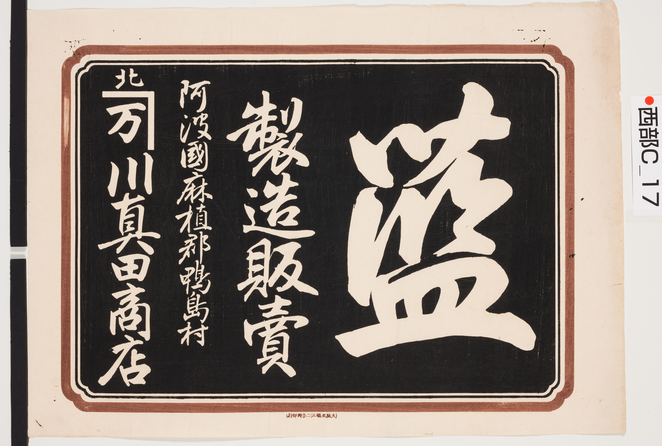 引札絵柄:「藍」の大字 商店場所:阿波国麻植郡鴨島村 商店名称:川真田商店 商売内容:藍製造販売