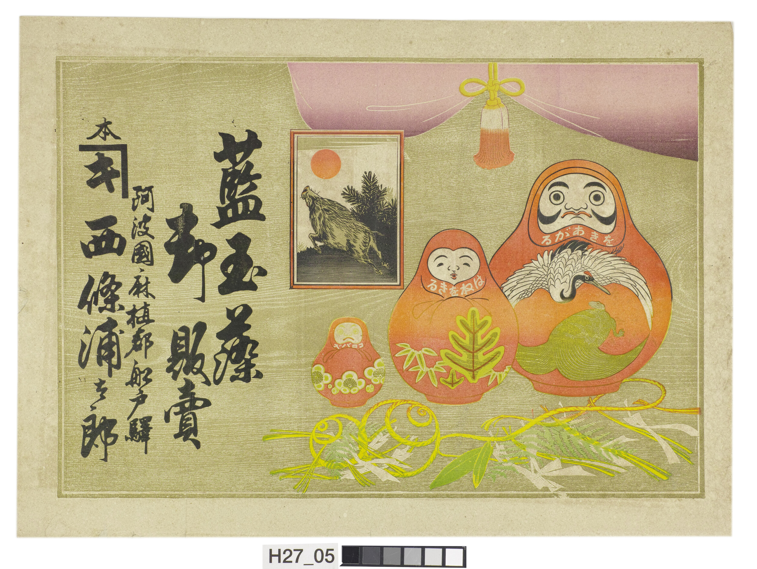 引札絵柄:だるま三体(おきあがる・はねおきる・ころばず)朝日に猪 商店場所:阿波国麻植郡舩戸駅 商店名称:西條浦太郎 商売内容:藍玉すくも卸販売