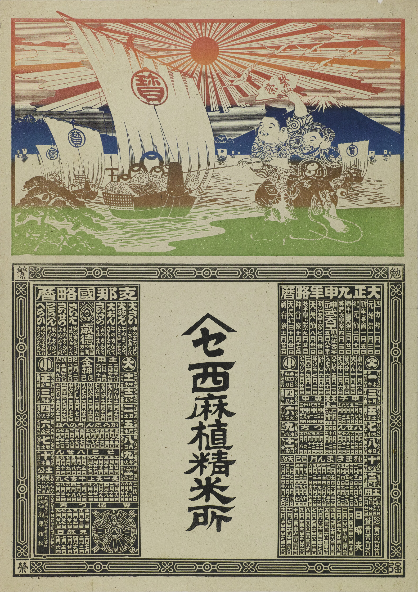 引札絵柄:恵比寿大黒の宝船、大正9申年略暦 商店場所:西麻植 商店名称:西麻植精米所 商売内容:精米