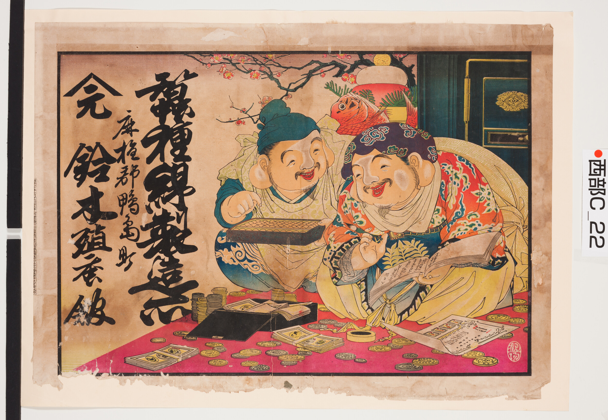 引札絵柄:恵比寿大黒の商い算用 商店場所:麻植郡鴨島町 商店名称:鈴木殖蚕館 商売内容:蚕種綿製造所