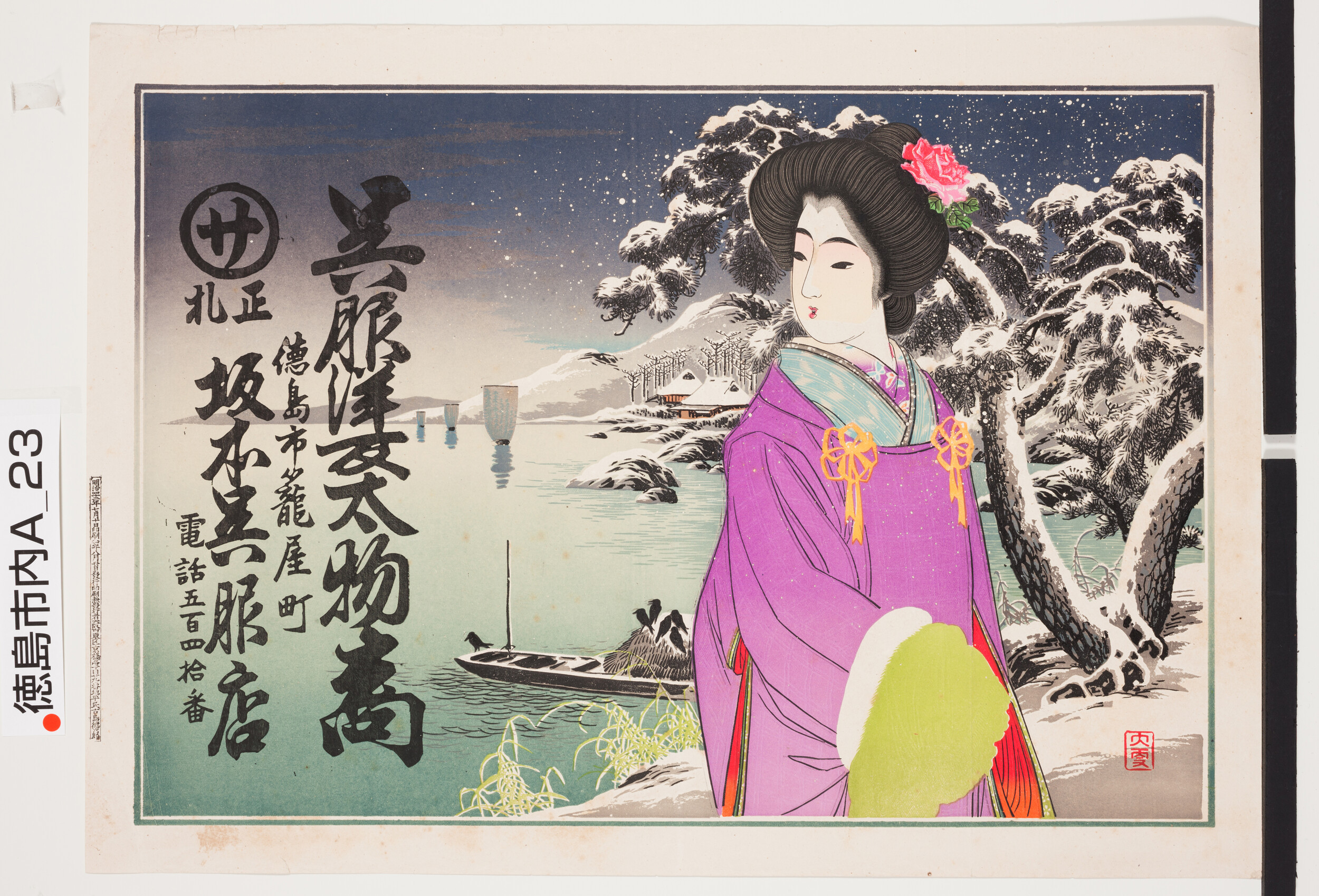 引札絵柄:雪景色の中の女性 商店場所:徳島市籠屋町 商店名称:坂本呉服店 商売内容:呉服洋反太物商