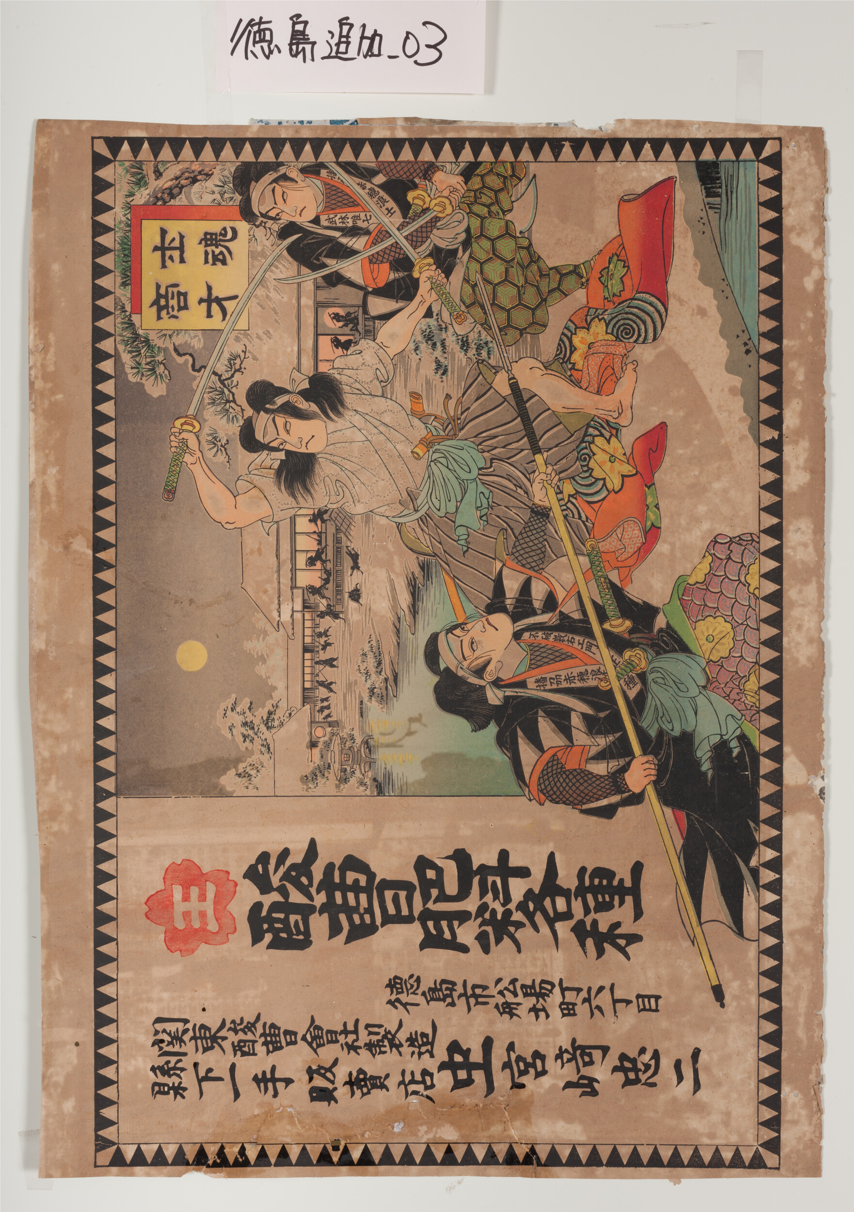 引札絵柄:士魂商才 赤穂浪士 商店場所:徳島市船場町6丁目 商店名称:関東酸曹会社製造 県下一手販売店 宮崎忠二 商売内容:酸曹肥料各種