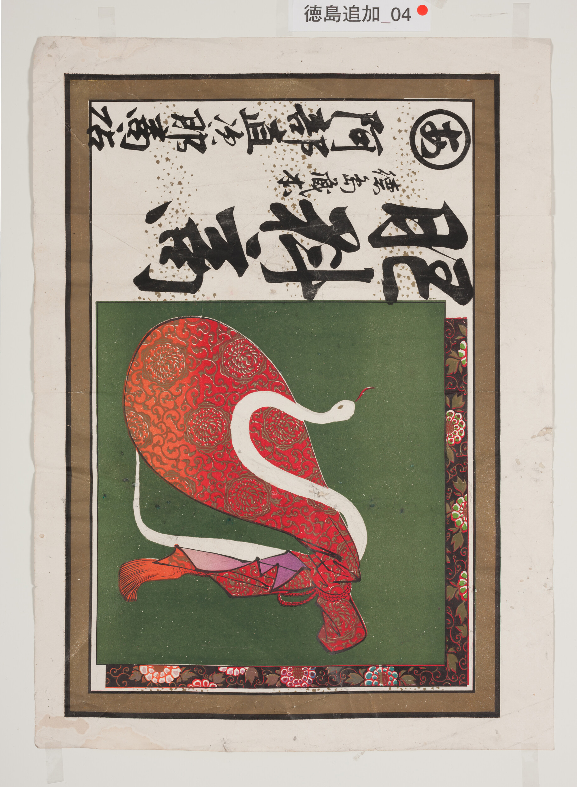 引札絵柄:白蛇と琵琶(巳年の引札) 商店場所:徳島蔵本 商店名称:阿部直次郎商店 商売内容:肥料商