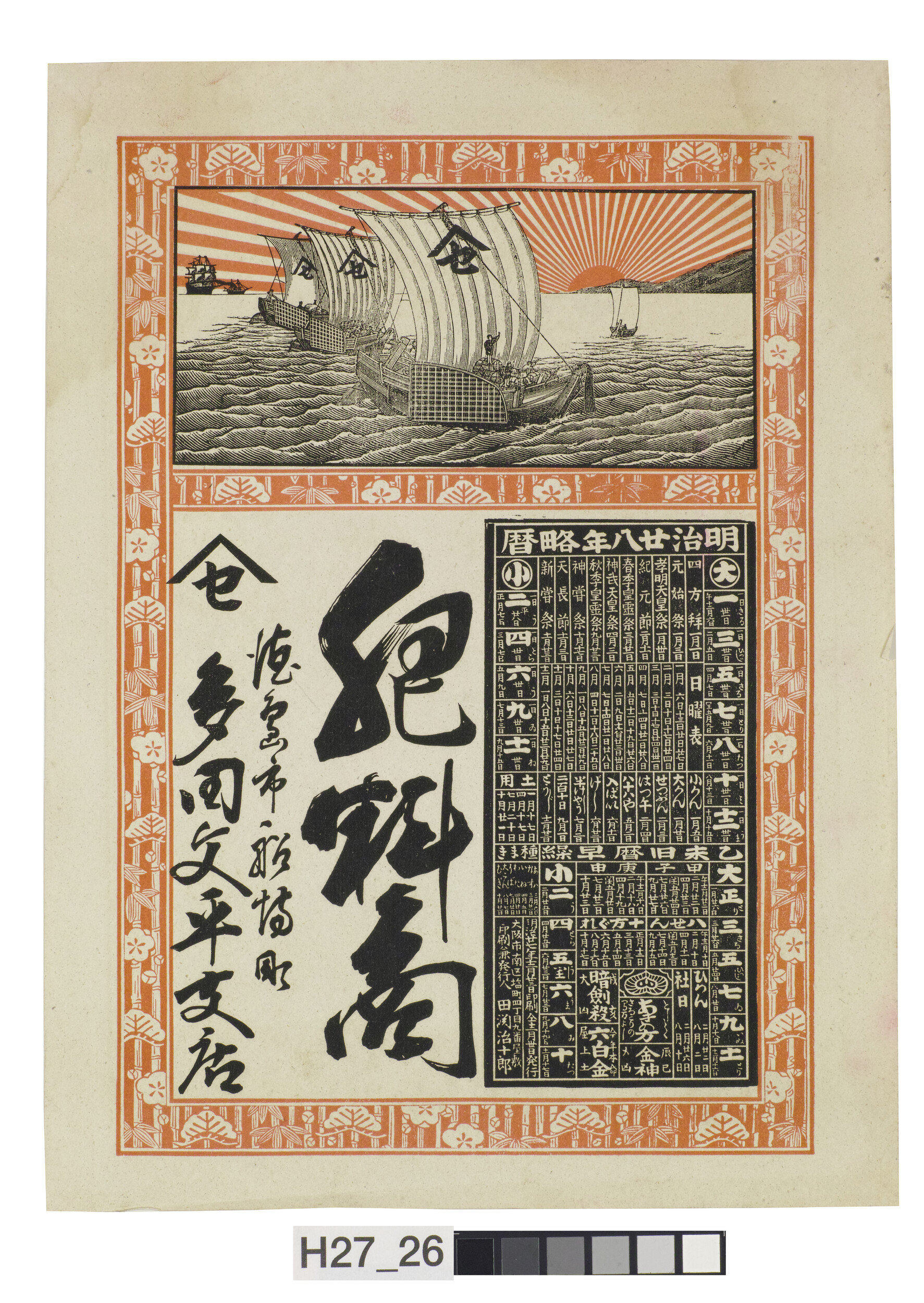 引札暦:明治28年略暦 商店場所:徳島市船場町 商店名称:多田文平支店 商売内容:肥料商