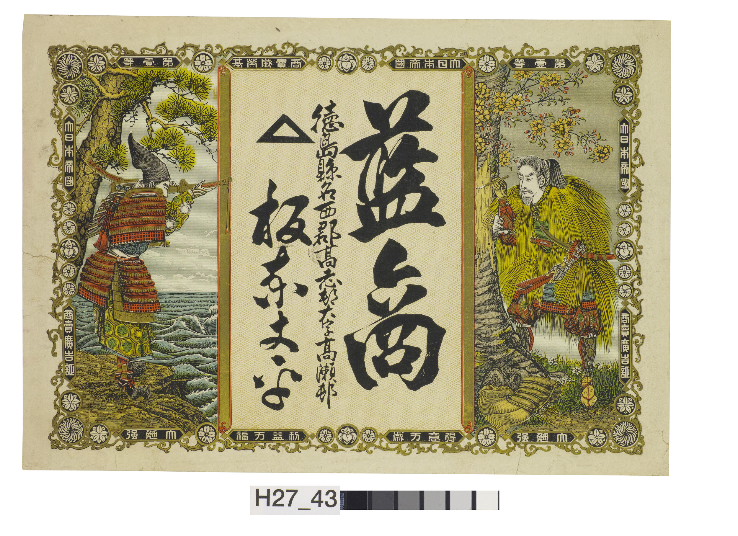 引札絵柄:太平記の忠義桜の場面か (児島高徳が桜の幹を削って詩を書こうとしている) 商店場所:徳島県名西郡高志村大字高瀬邨 商店名称:板東丈平 商売内容:藍商