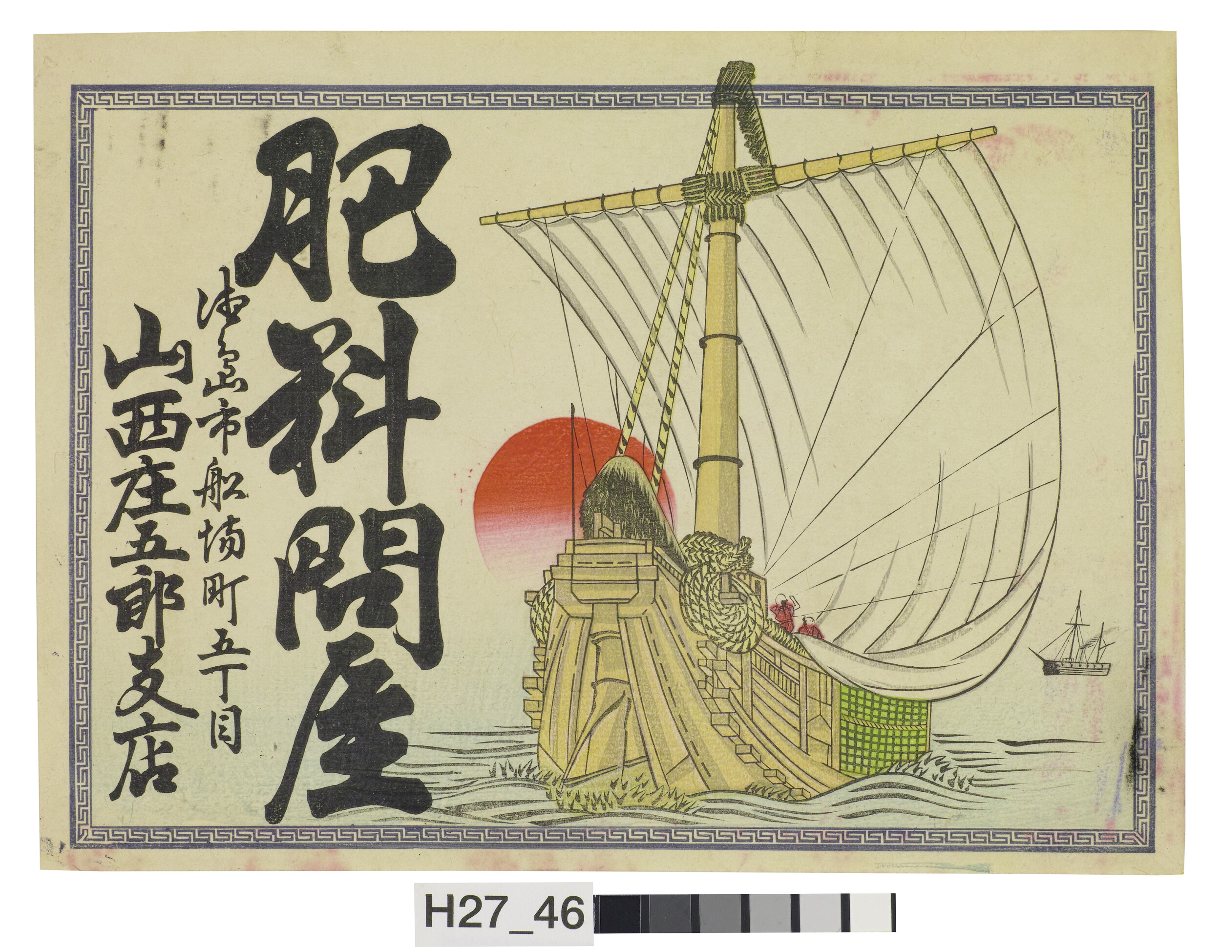 引札絵柄:朝日と千石船(弁才船) 商店場所:徳島市船場町5丁目 商店名称:山西庄五郎支店 商売内容:肥料問屋