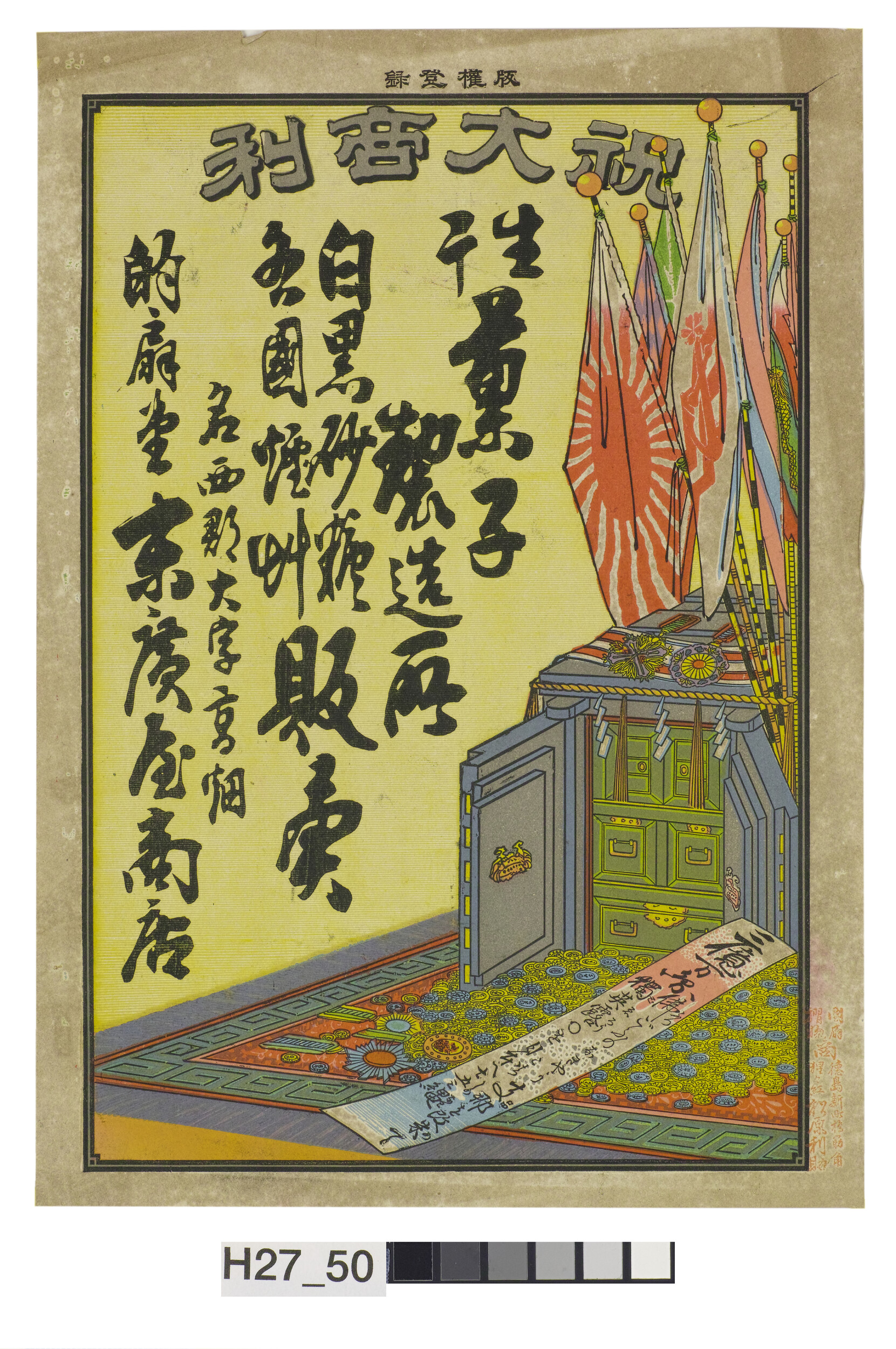引札絵柄:祝大商利 旭日旗 金庫前の短冊「三億万円ふつごうのなきよう支那(品)を改めて・・・」 商店場所:名西郡大字高畑 商店名称:的扇堂 末広屋商店 商売内容:生干菓子製造所 白黒砂糖各国煙草販売
