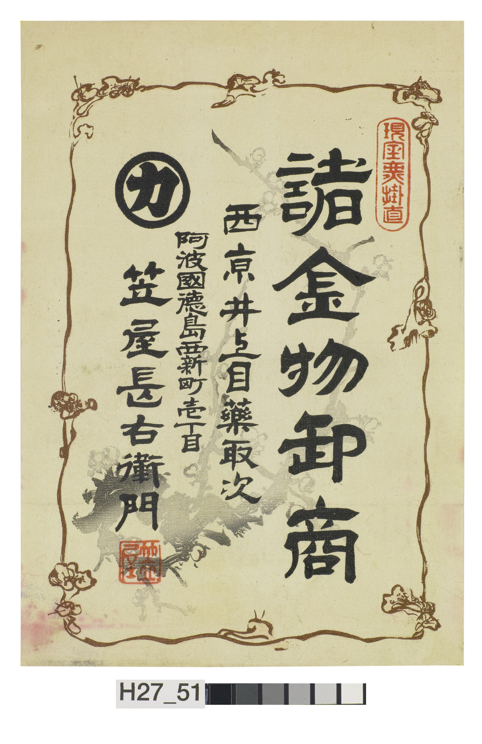 引札絵柄:背景 梅の水墨絵 「朱で現金無掛値」 商店場所:阿波国徳島西新町1丁目 商店名称:笠屋長右衛門 商売内容:諸金物卸商 西京井上目薬取次
