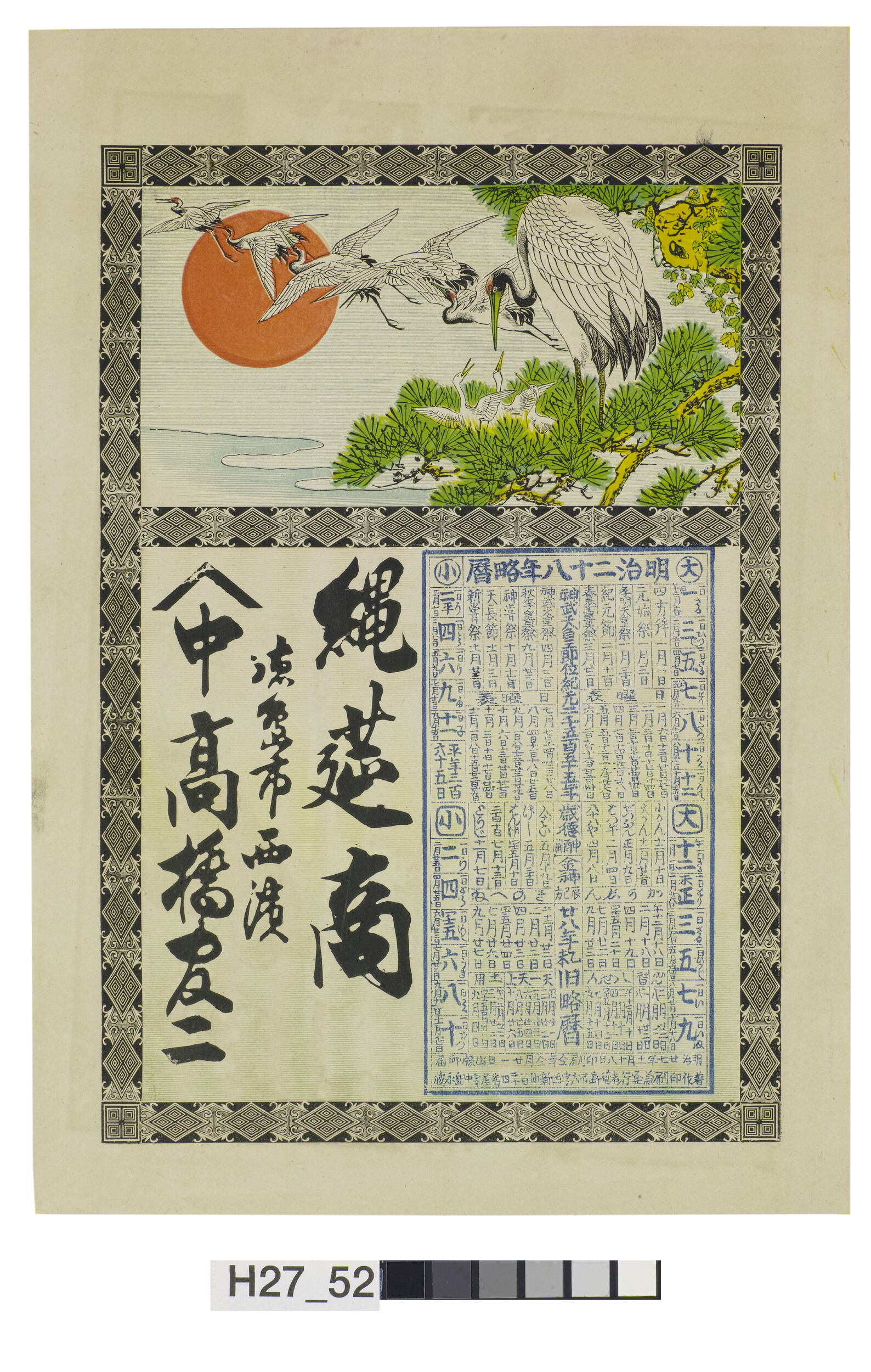 引札暦:明治28年略暦 朝日に飛翔鶴 商店場所:徳島市西浜 商店名称:高橋官二 商売内容:縄筵商