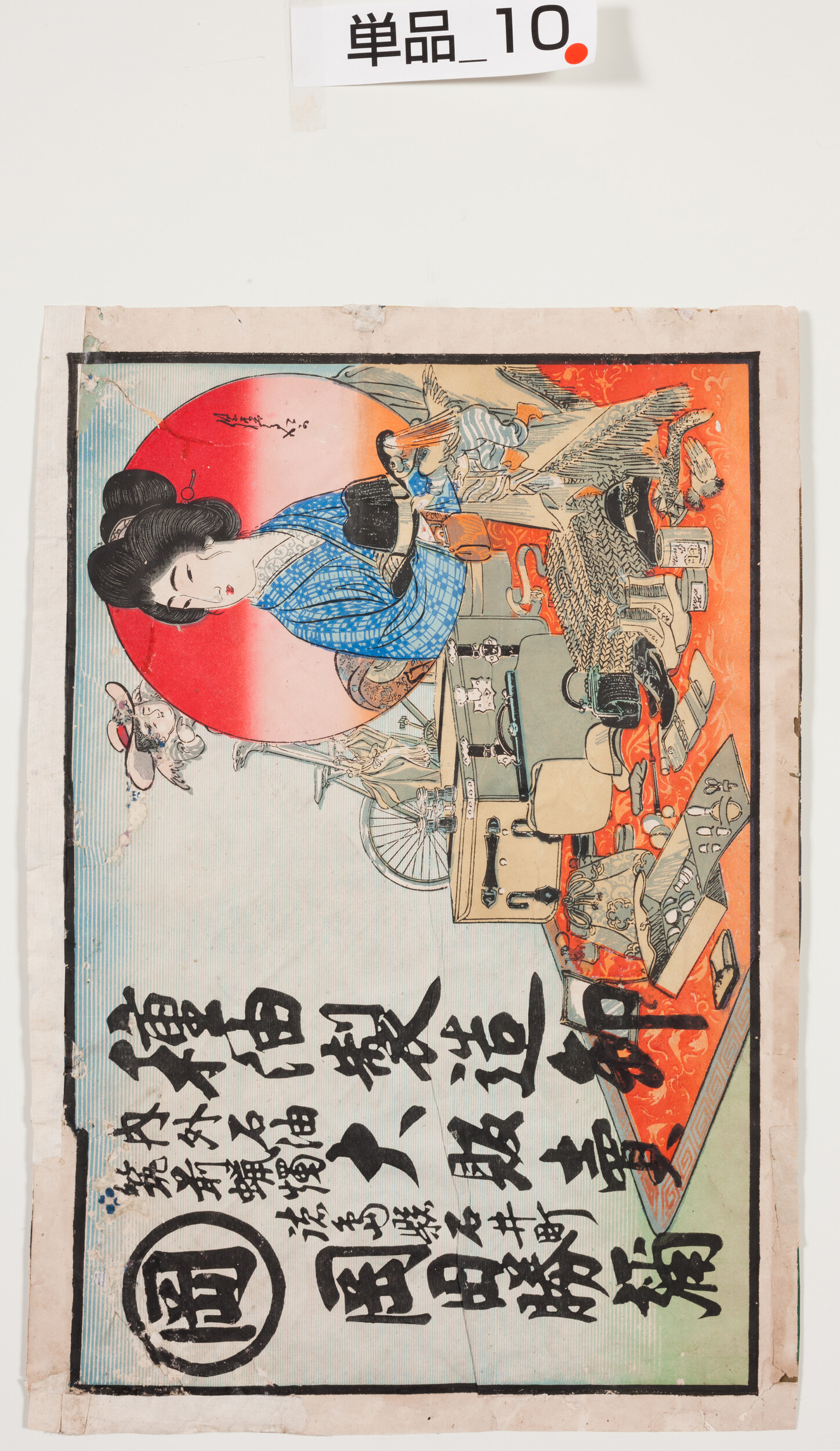 引札絵柄:紳士用の帽子を持った女人 自転車 旅行鞄 ブーツ ハンドバックなど 商店場所:徳島県石井町 商店名称:岡田勝弥 商売内容:種油製造卸内外石油 筑前?燭大販売