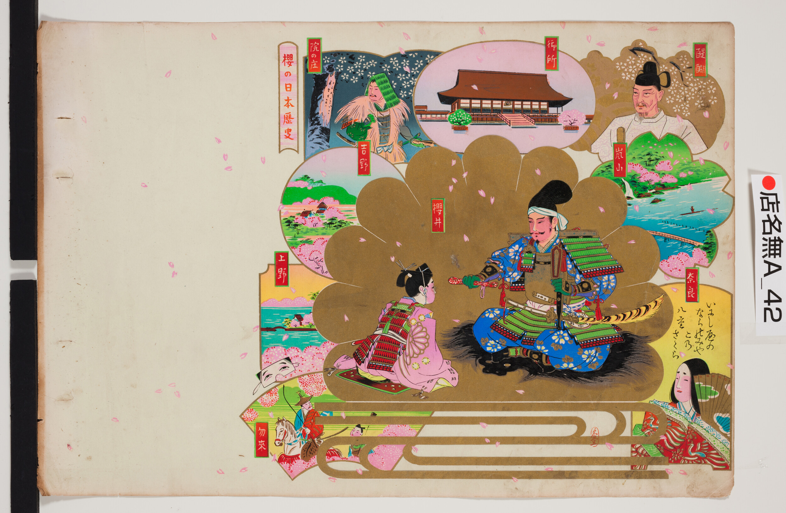 引札(名入れ前)桜の日本歴史 院の庄 吉野 上野 勿来 奈良ーいにしへのならのみやこの八重さくら 嵐山 後醍 御所 桜井ー楠木正成・正行親子の桜井の別れ