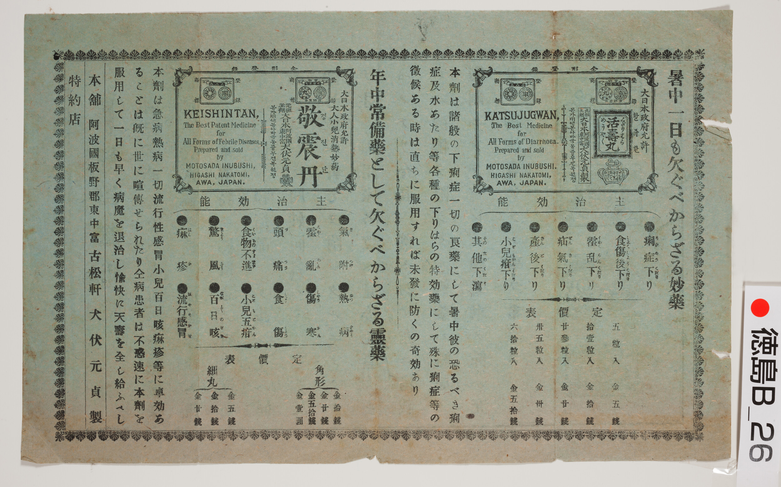 引札絵柄:字のみ(暑中一日も欠ぐべからざる妙薬、年中常備薬として欠ぐべからざる霊薬 商店場所:阿波国板野郡東中富 商店名称:古松軒 犬伏元貞製 商売内容:薬(敬震丹・活寿丸)