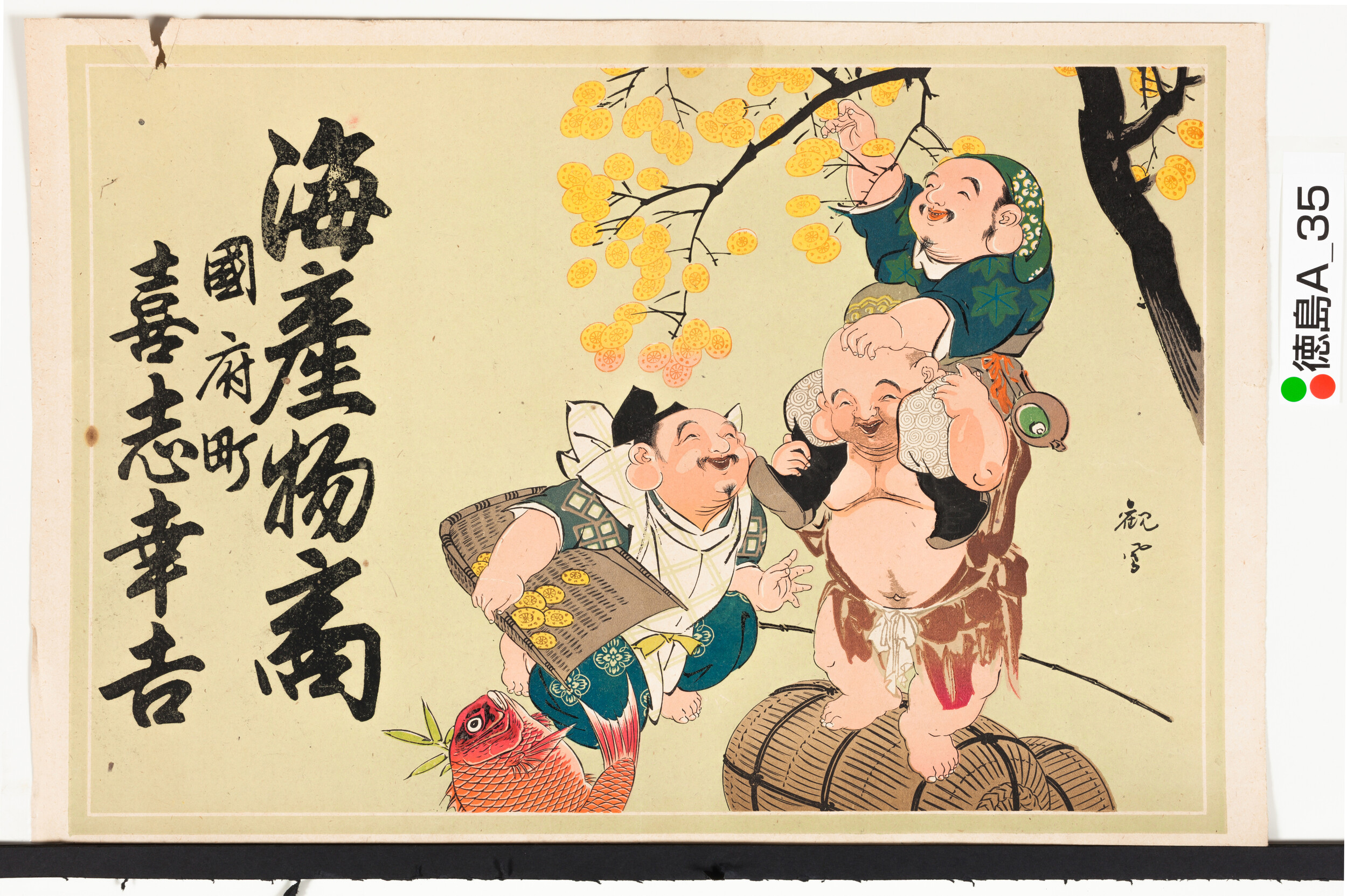 引札絵柄:小判のなる木 肩車 恵比寿大黒 鯛 商店場所:国府町 商店名称:喜志幸吉 商売内容:海産物商