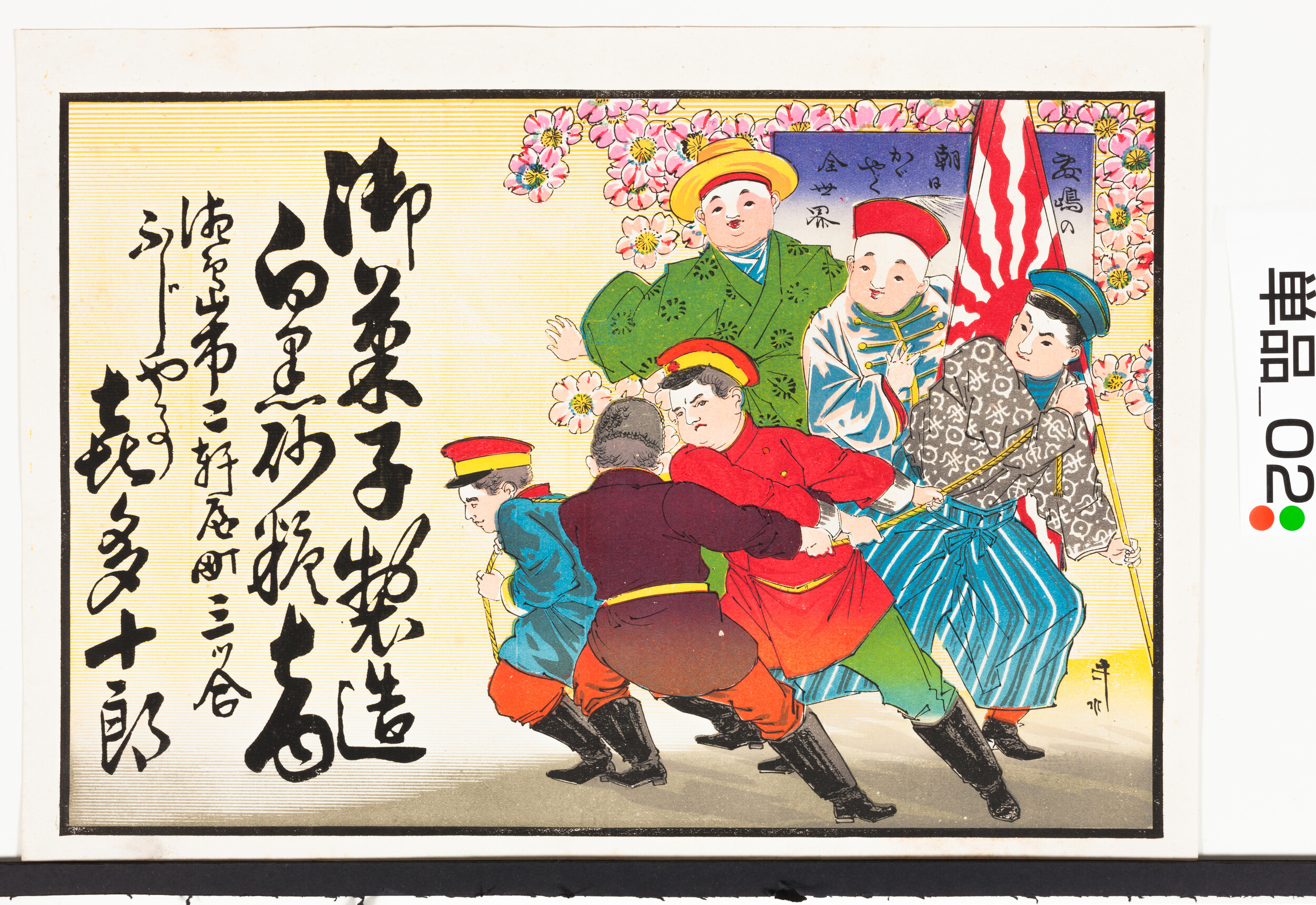 引札絵柄:三国干渉 (旭日旗を持つ日本の少年後に清・朝鮮の子、綱引きの相手は露・独・仏の子) 商店場所:徳島市二軒屋町三ツ合 商店名称:ふじや事 喜多十郎 商売内容:御菓子製造 白黒砂糖商