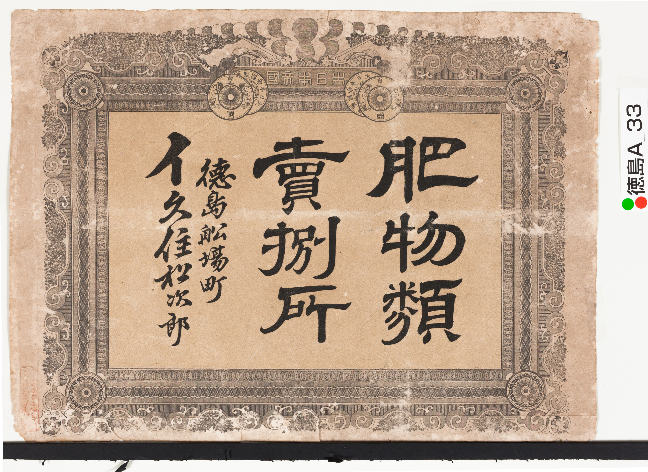 引札絵柄:大日本帝国の額欄紙に字のみ 商店場所:徳島舩場町 商店名称:久住松次郎 商売内容:肥物類売捌所