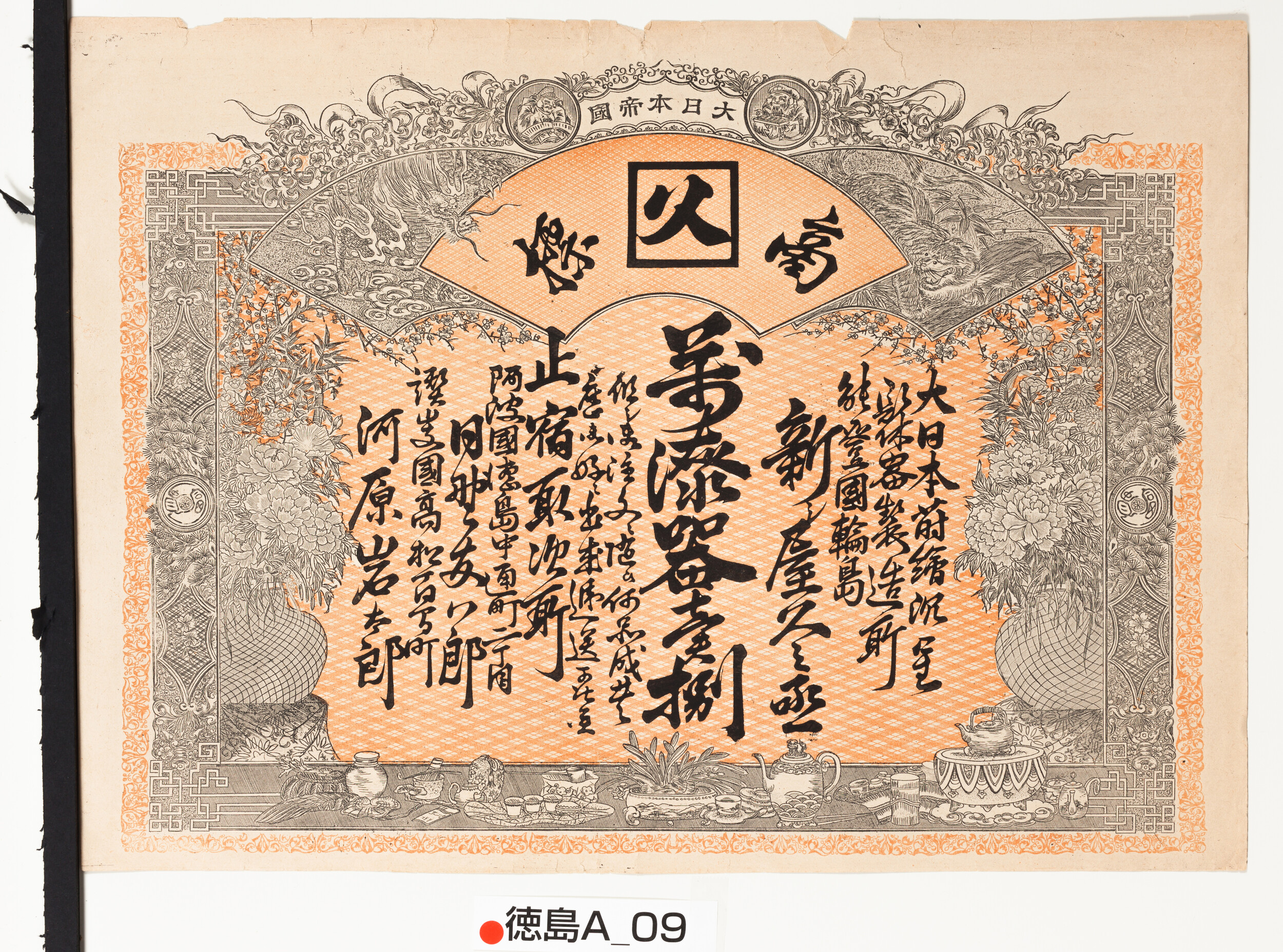 引札絵柄:賞状用紙に字のみ(大日本蒔絵沈金きゅう器製造所能登国輪島新シ屋久之丞・・ 商店場所:阿波国徳島中通町2丁目 商店名称:日野友八郎 商売内容:萬漆器売捌止宿取次所