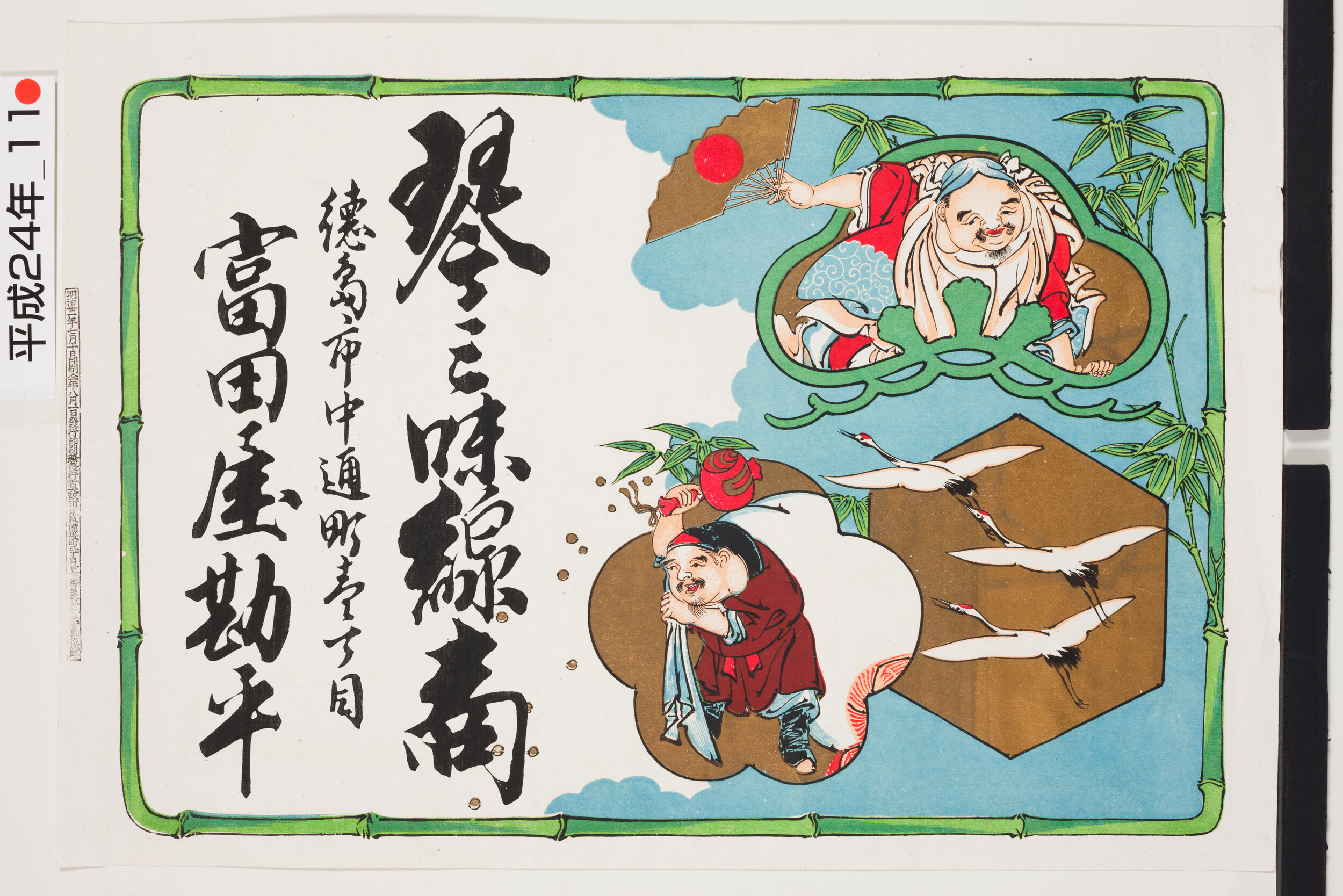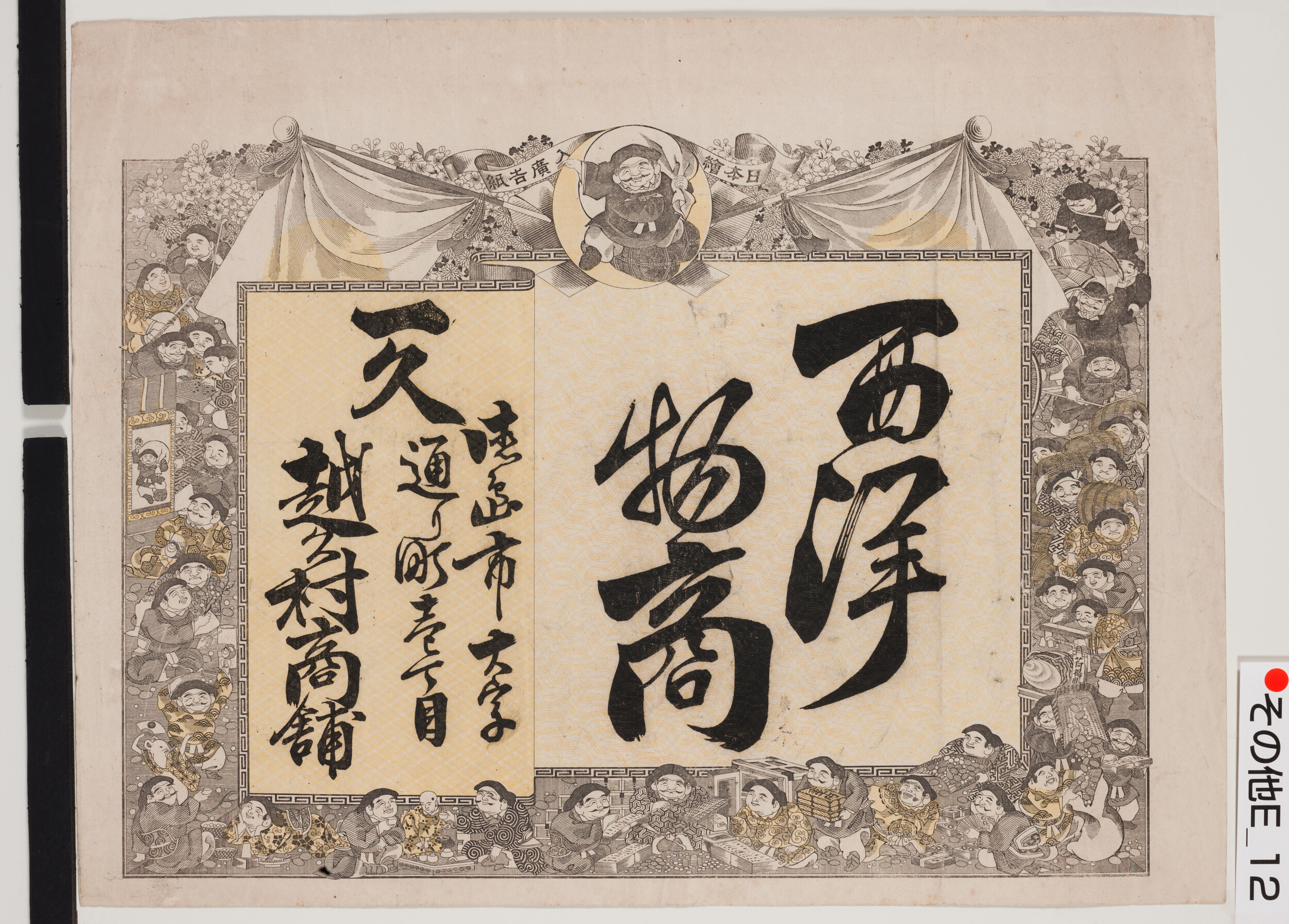 引札絵柄:日本絵入広告紙 大黒様づくし 商店場所:徳島市大字通り町1丁目 商店名称:越久村商舗 商売内容:西洋物商