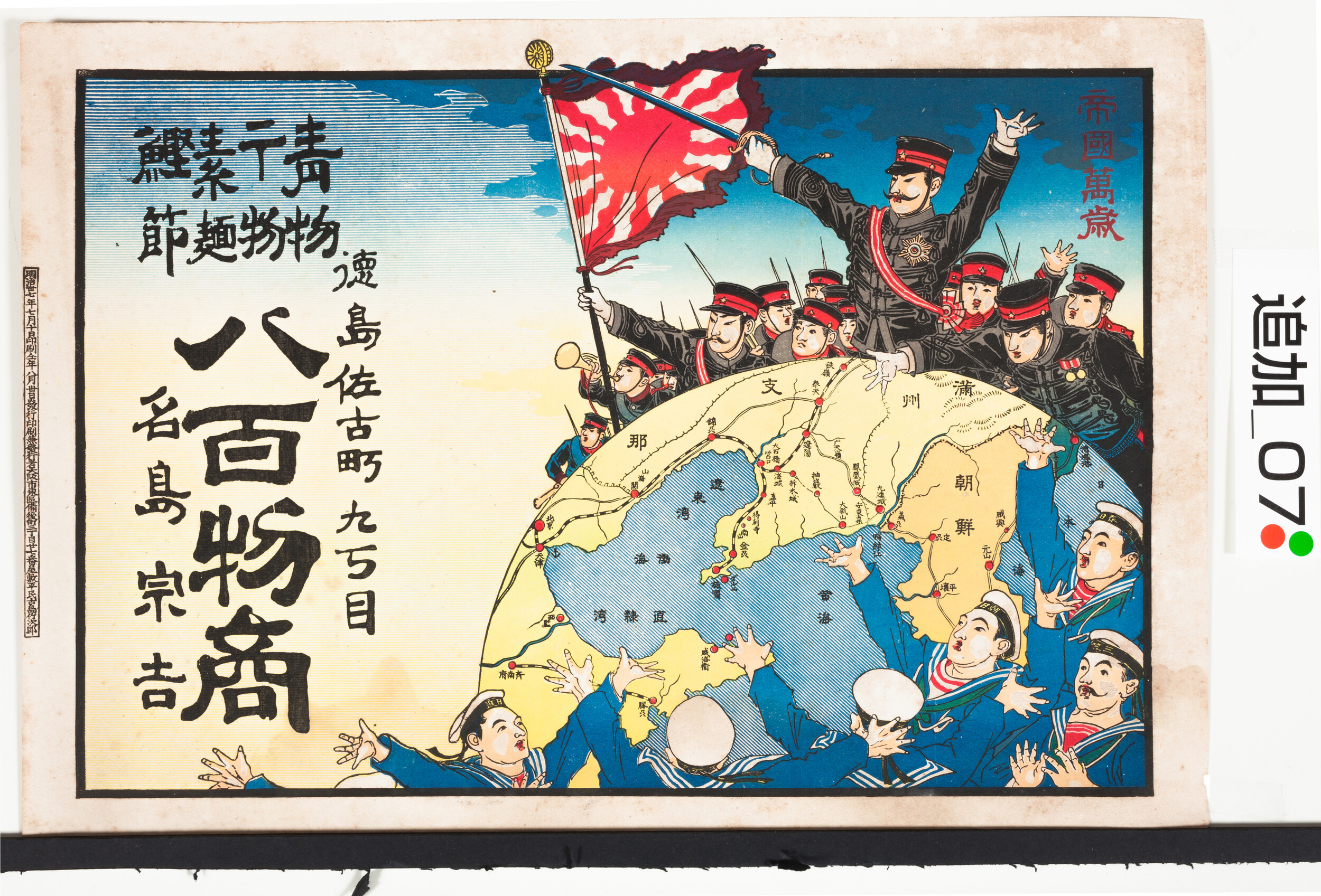 引札絵柄:帝国万歳 商店場所:徳島佐古町9丁目 商店名称:名島宗吉 商売内容:青物 干物 素麺 鰹節