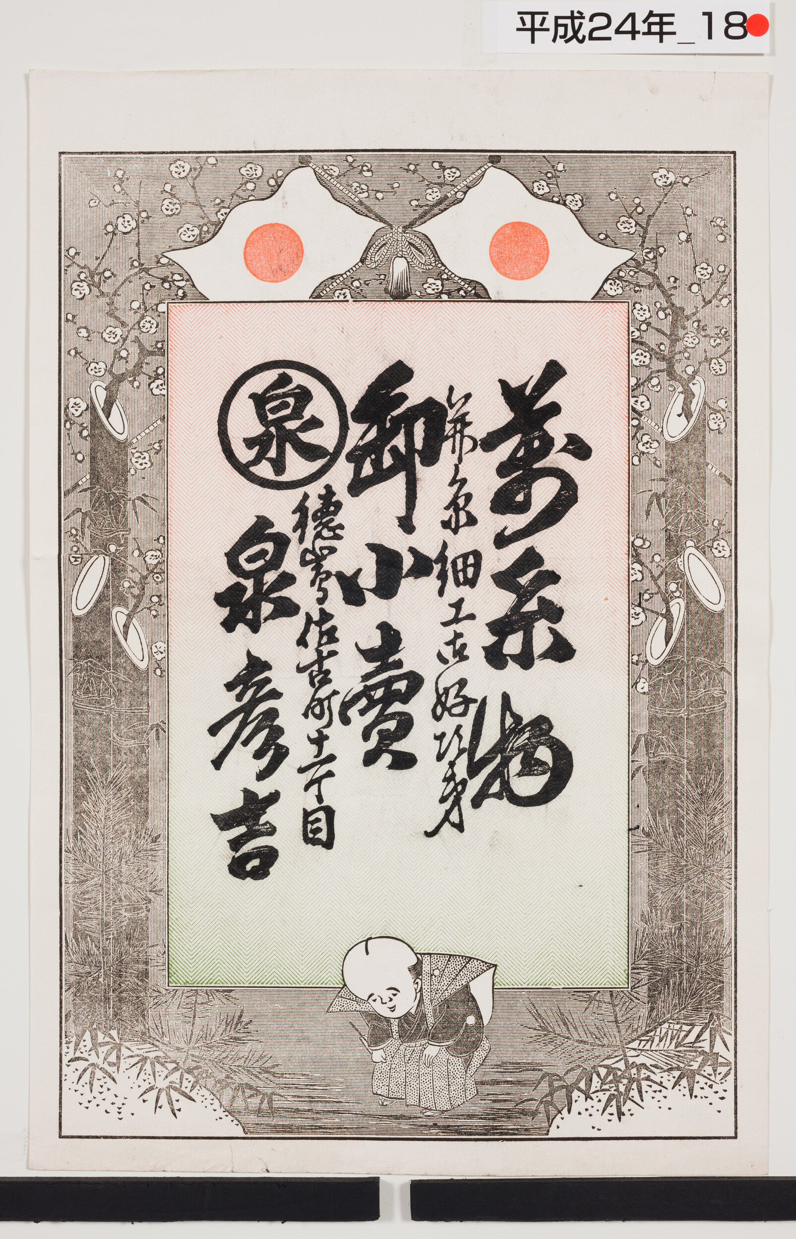 引札絵柄:松竹梅 上部に国旗 下部に福助のお辞儀 商店場所:徳島佐古町11丁目 商店名称:泉彦吉 商売内容:萬糸物并糸細工御好次第 御小売