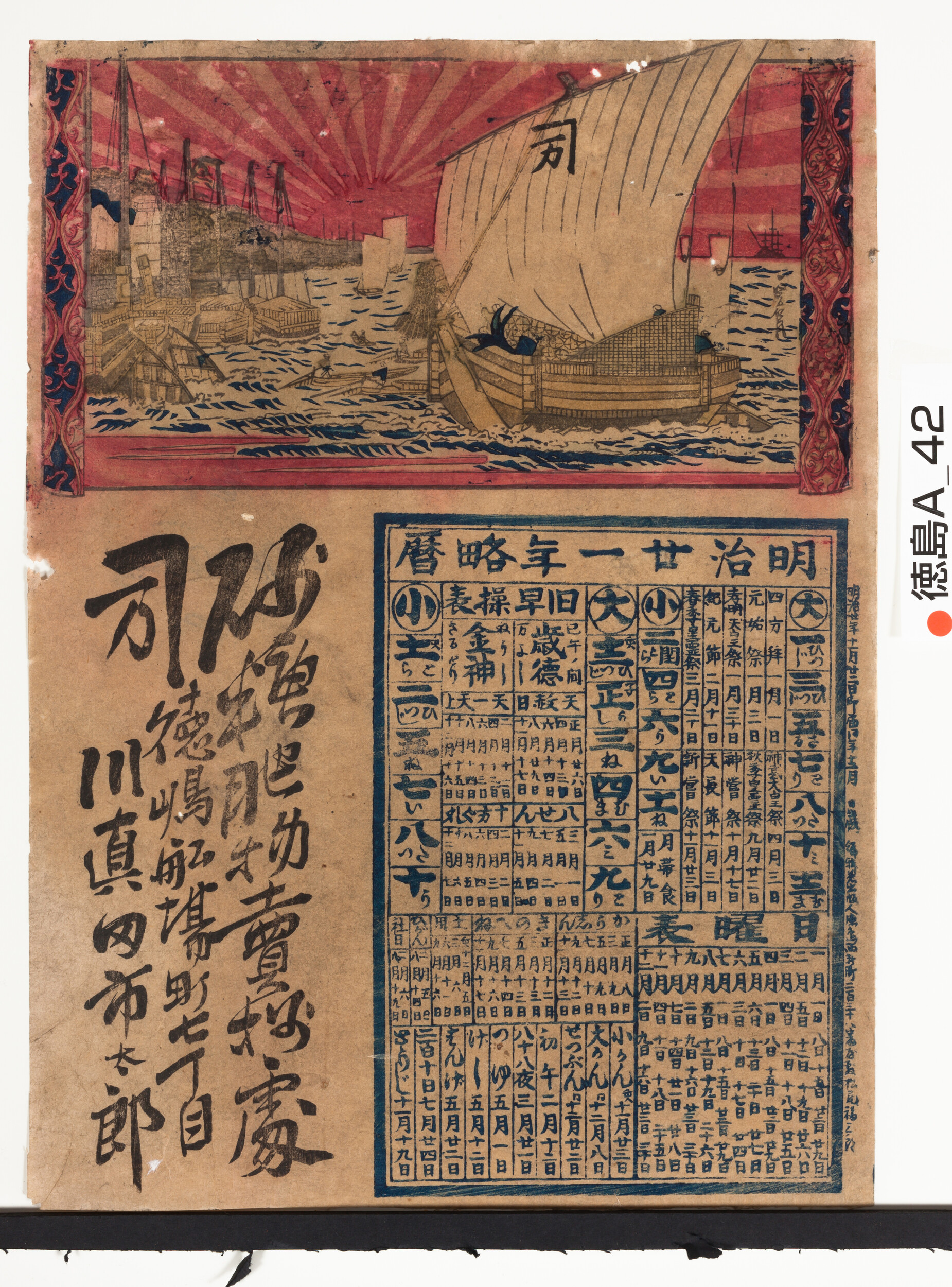引札暦:明治21年略暦 朝日に帆掛け船の絵 商店場所:徳島市西新町5丁目 商店名称:川真田市太郎 商売内容:砂糖肥物売捌処