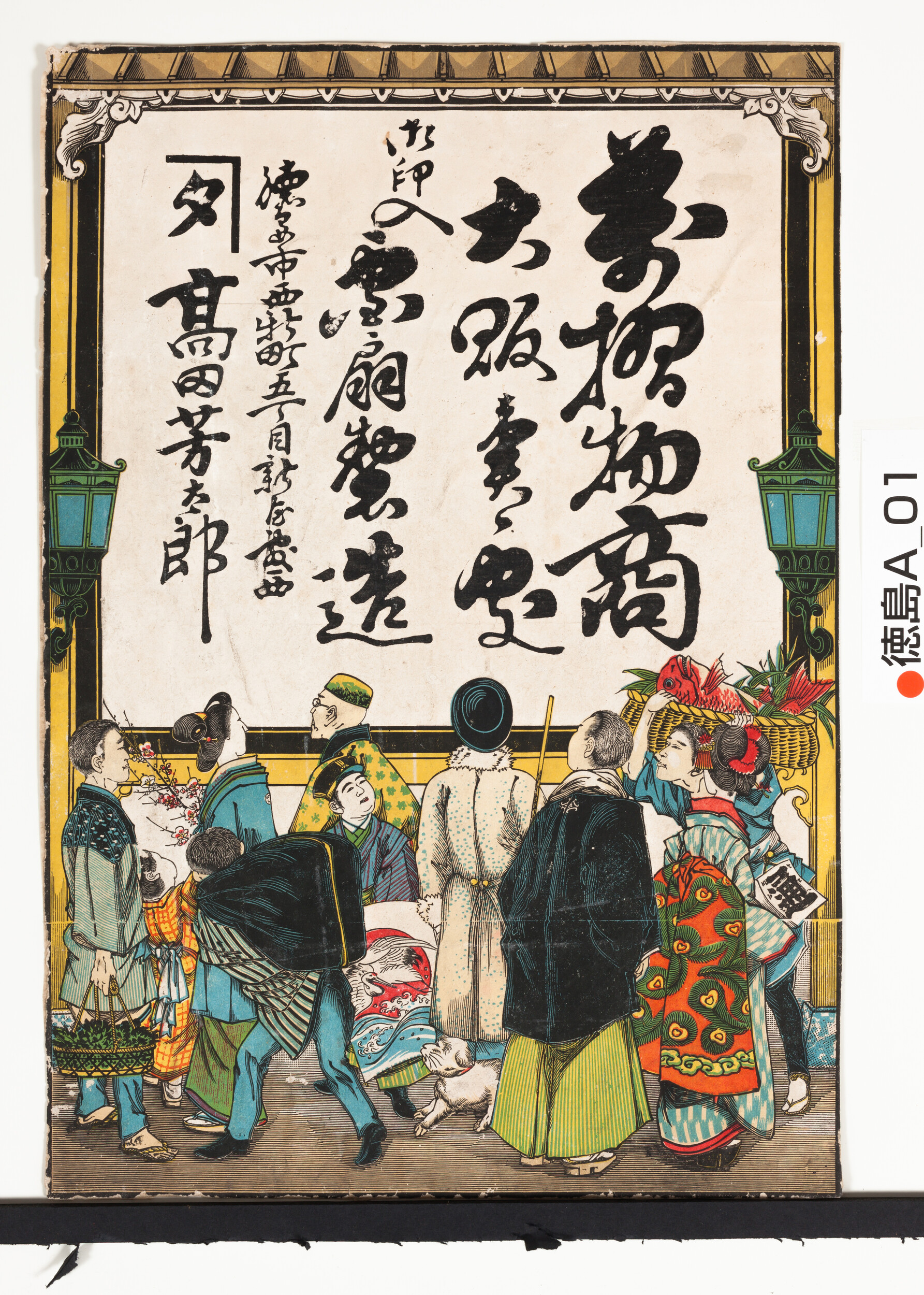 引札絵柄:街頭広告 商店場所:徳島市西新町5丁目新屋敷西 商店名称:高田芳太郎 商売内容:萬摺物商大販売所 御印入団扇製造