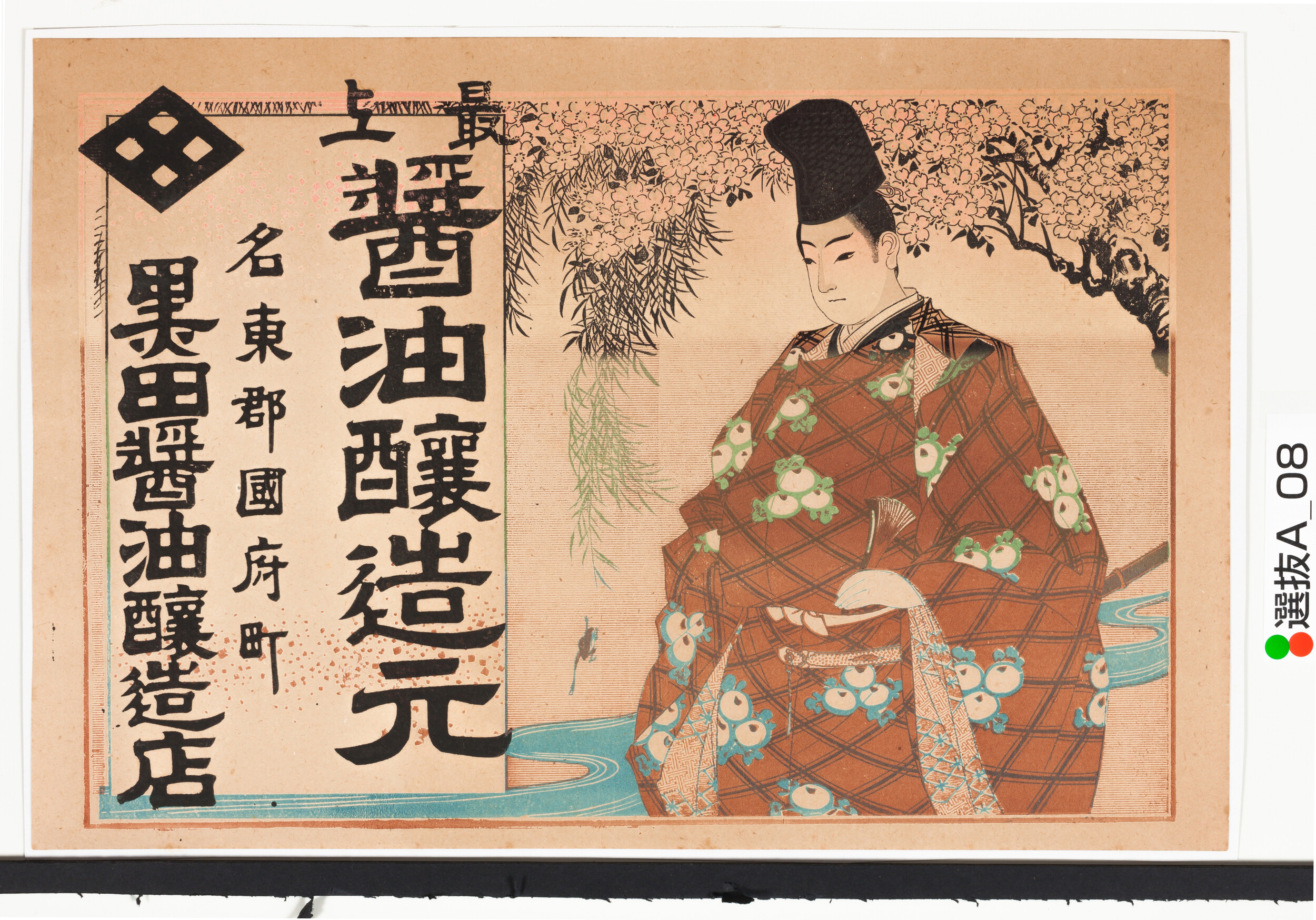引札絵柄:小野道風 柳に飛びつく蛙 商店場所:名東郡国府町 商店名称:黒田醤油醸造店 商売内容:最上醤油醸造元