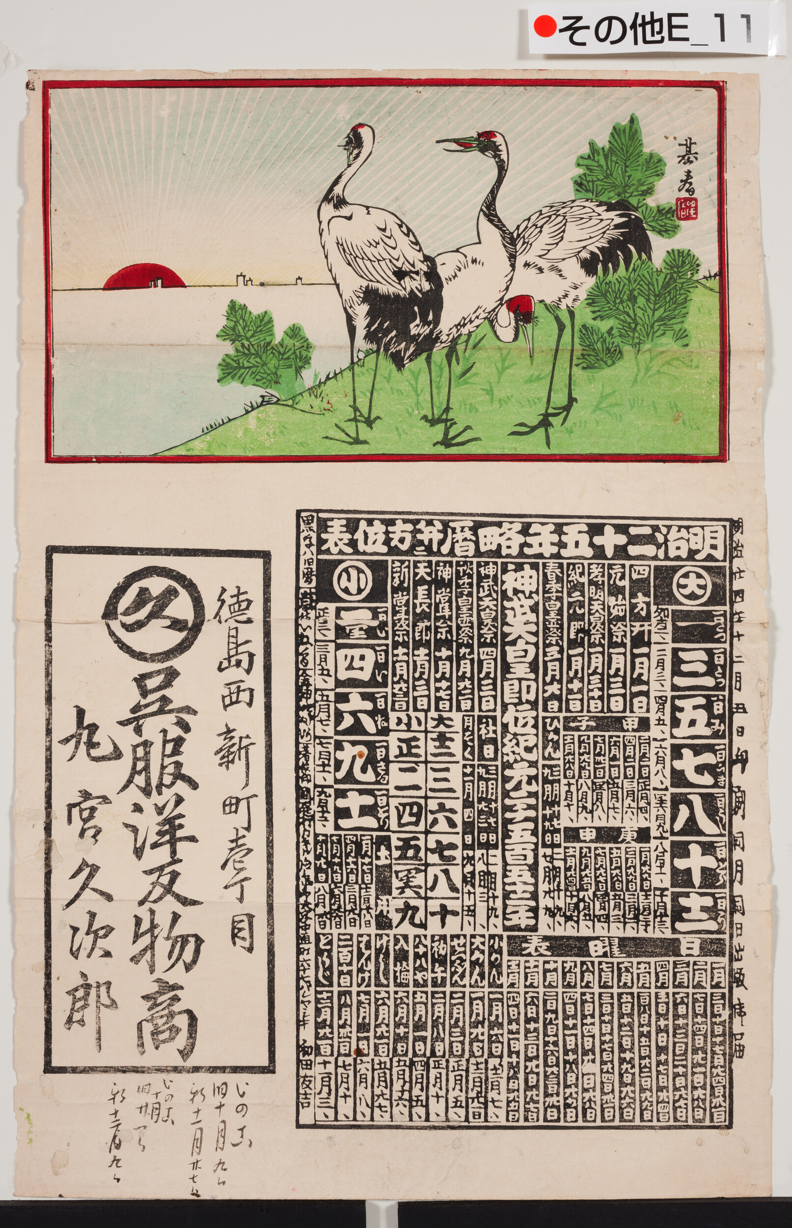 引札絵柄:明治25年略暦并ニ方位表 朝日と鶴 商店場所:徳島西新町一丁目 商店名称:呉服洋反物商 商売内容:丸宮久次郎