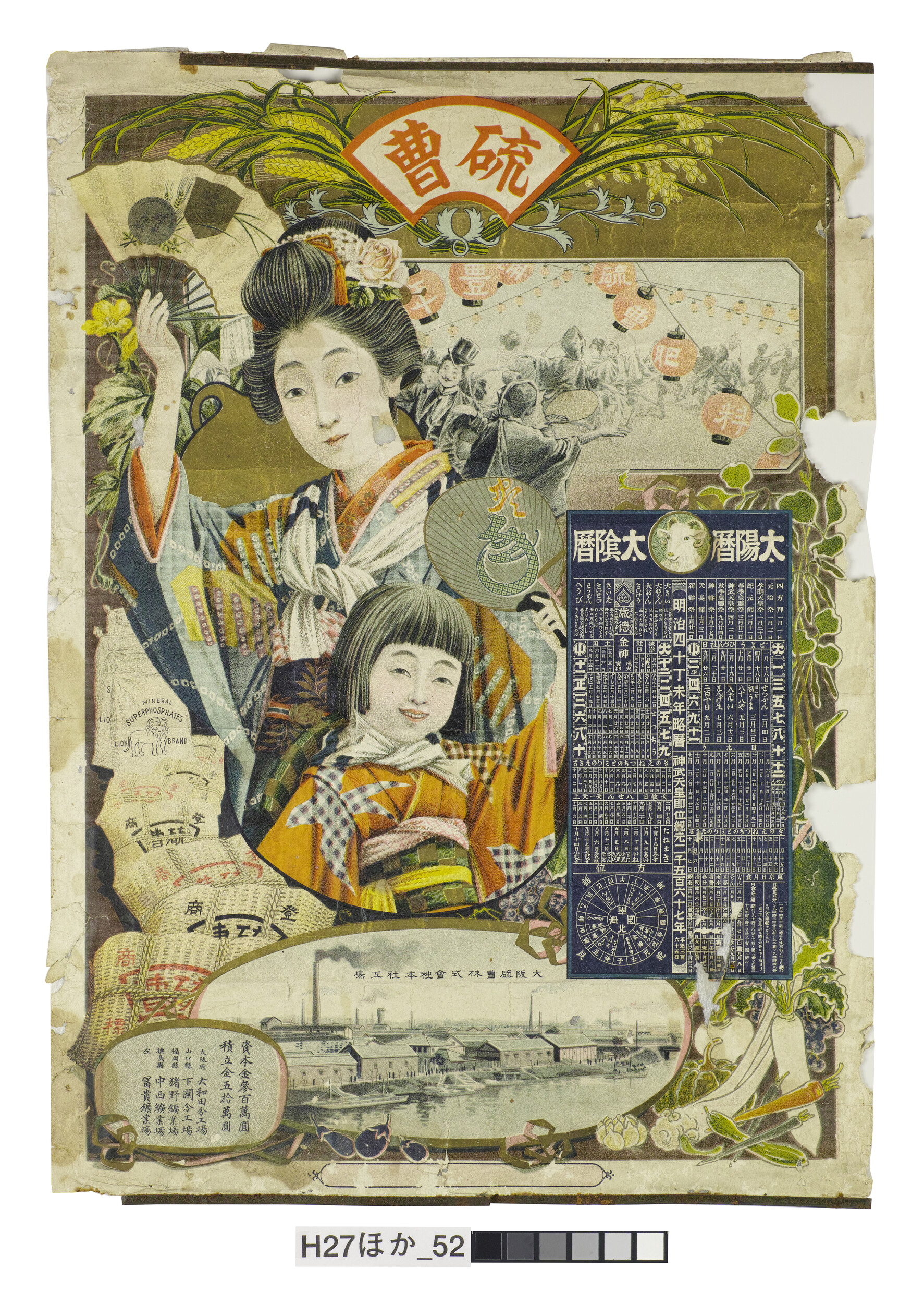 引札絵柄:豊年踊り 母子の絵 明治40丁未年略暦 商店場所:大阪 商店名称:大阪硫曹株式会社 商売内容:肥料