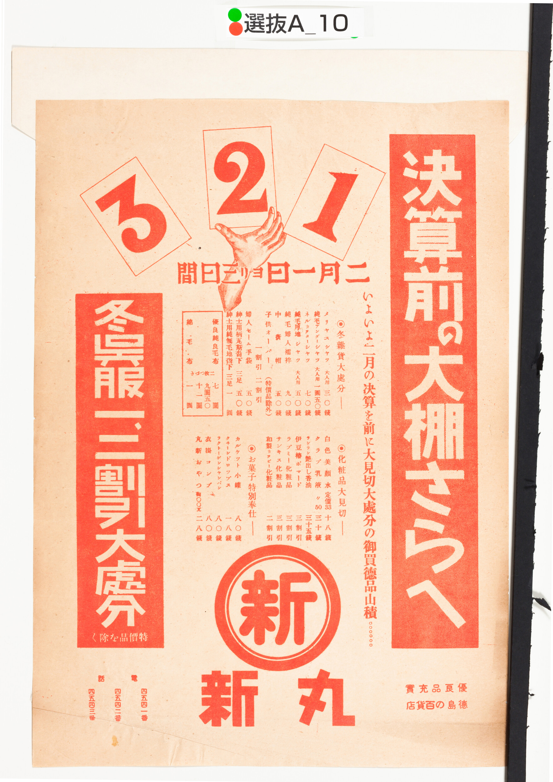 広告 商売場所:徳島市 商店名称:丸新 商売内容:呉服、化粧品、御菓子など 印刷絵柄:決算前の大棚さらえ