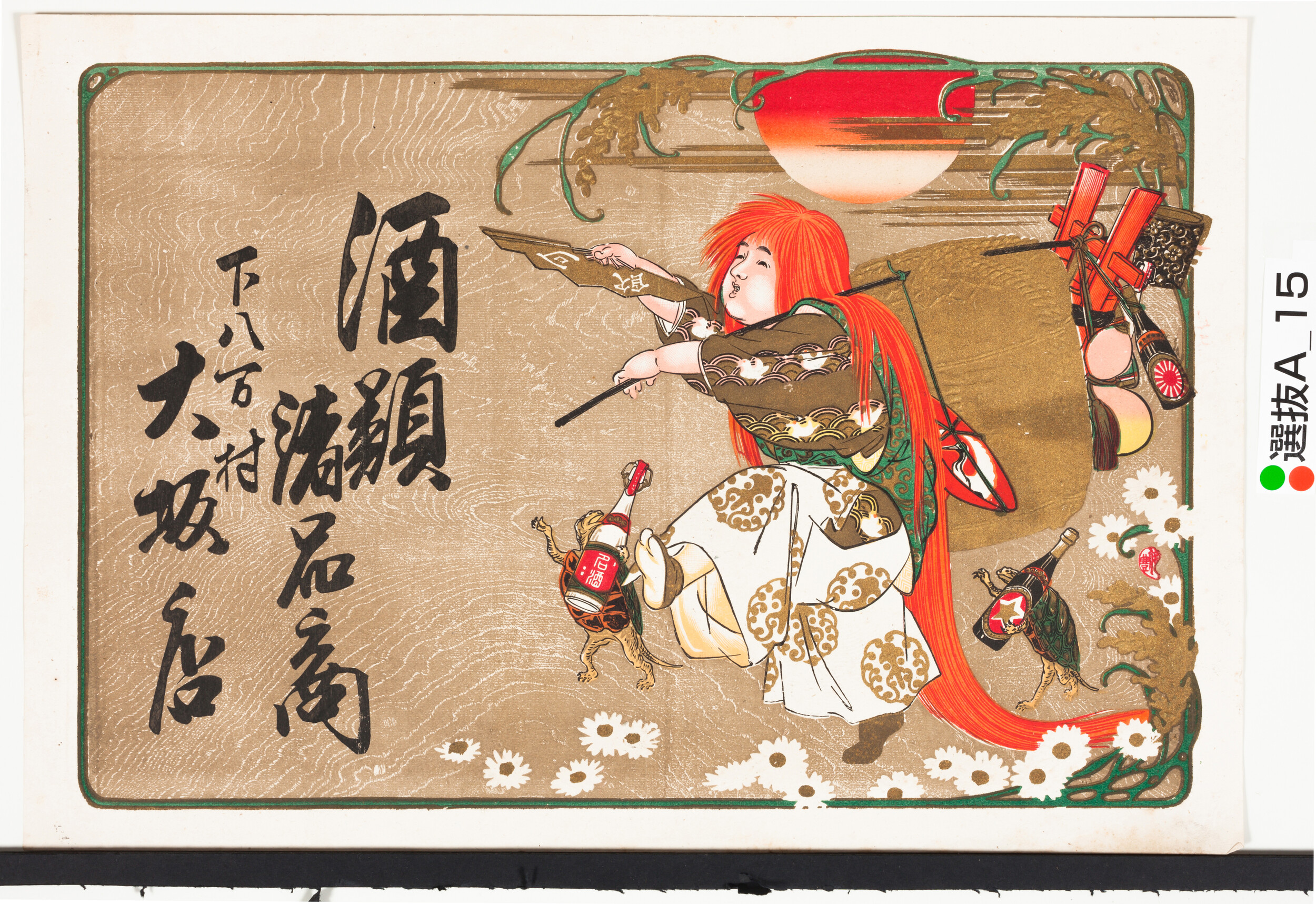 引札絵柄:猩々と名酒のビンを抱える亀 商店場所:下八万村 商店名称:大坂店 商売内容:酒類諸品商