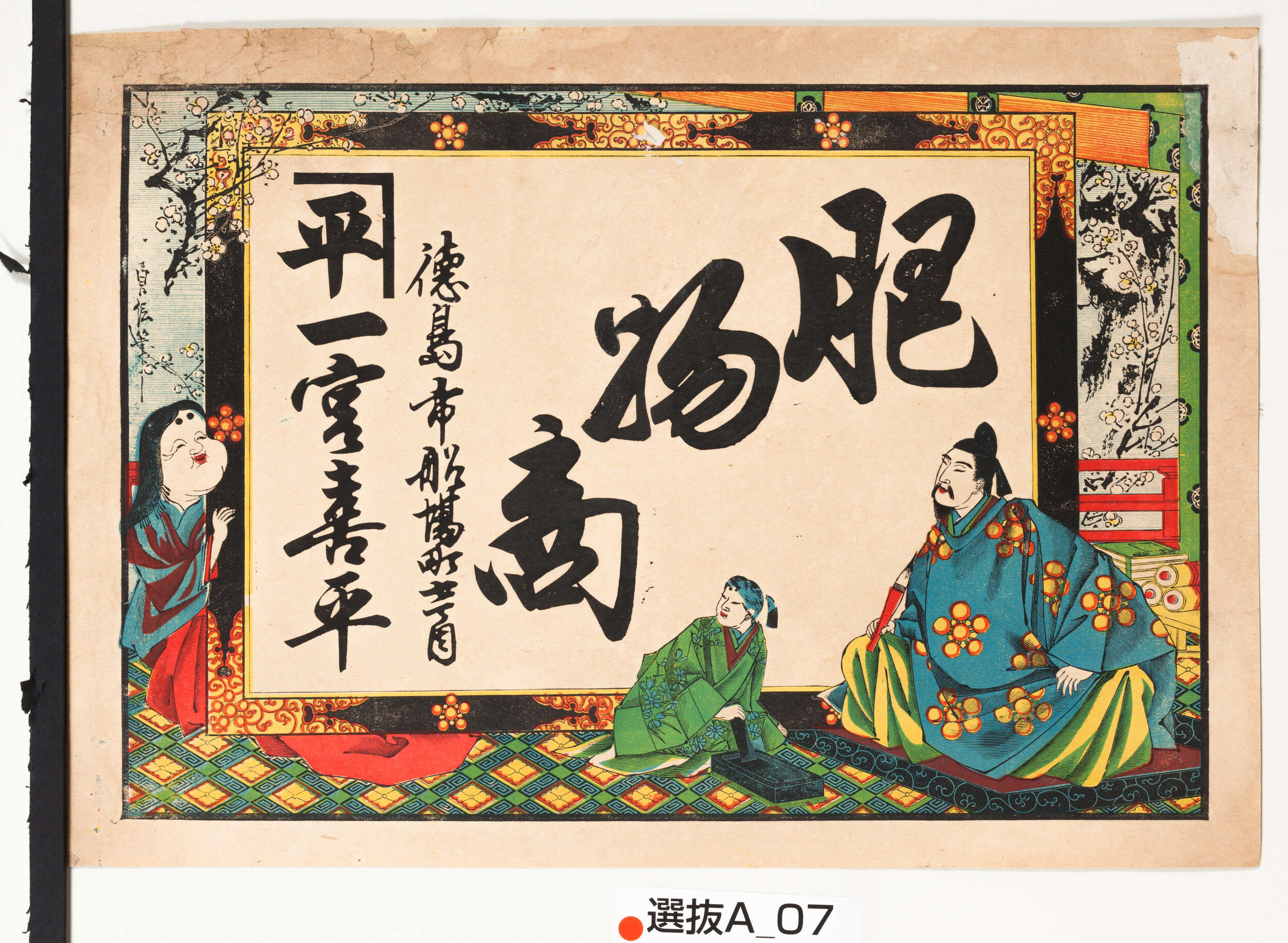 引札絵柄:菅原の道真と看板から覗くお多福 商店場所:徳島市船場町□丁目 商店名称:一宮喜平 商売内容:肥物商