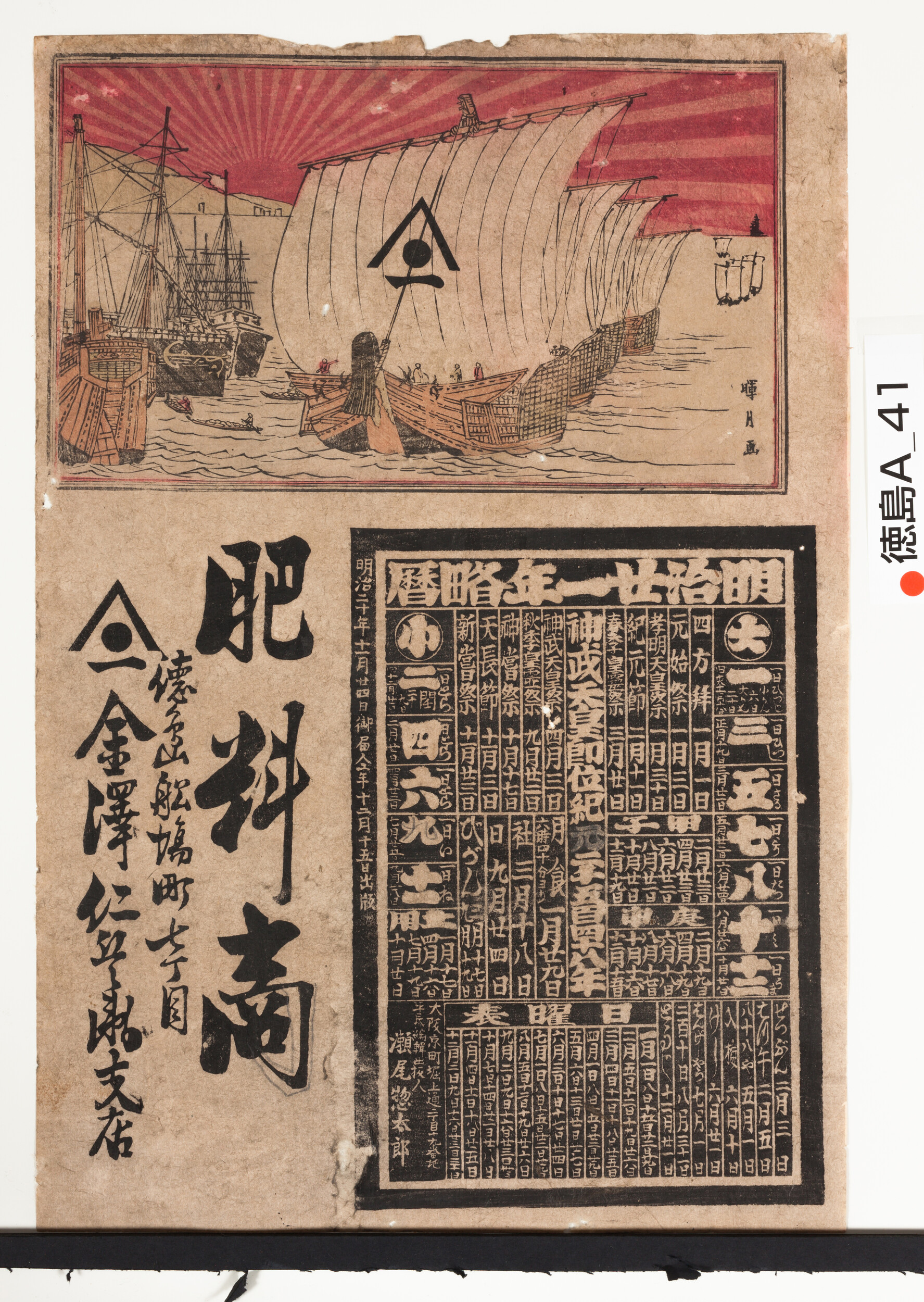 引札暦:千石船 港 明治21年略暦 商店場所:徳島船場町七丁目 商店名称:金沢仁兵衛支店 商売内容:肥料商