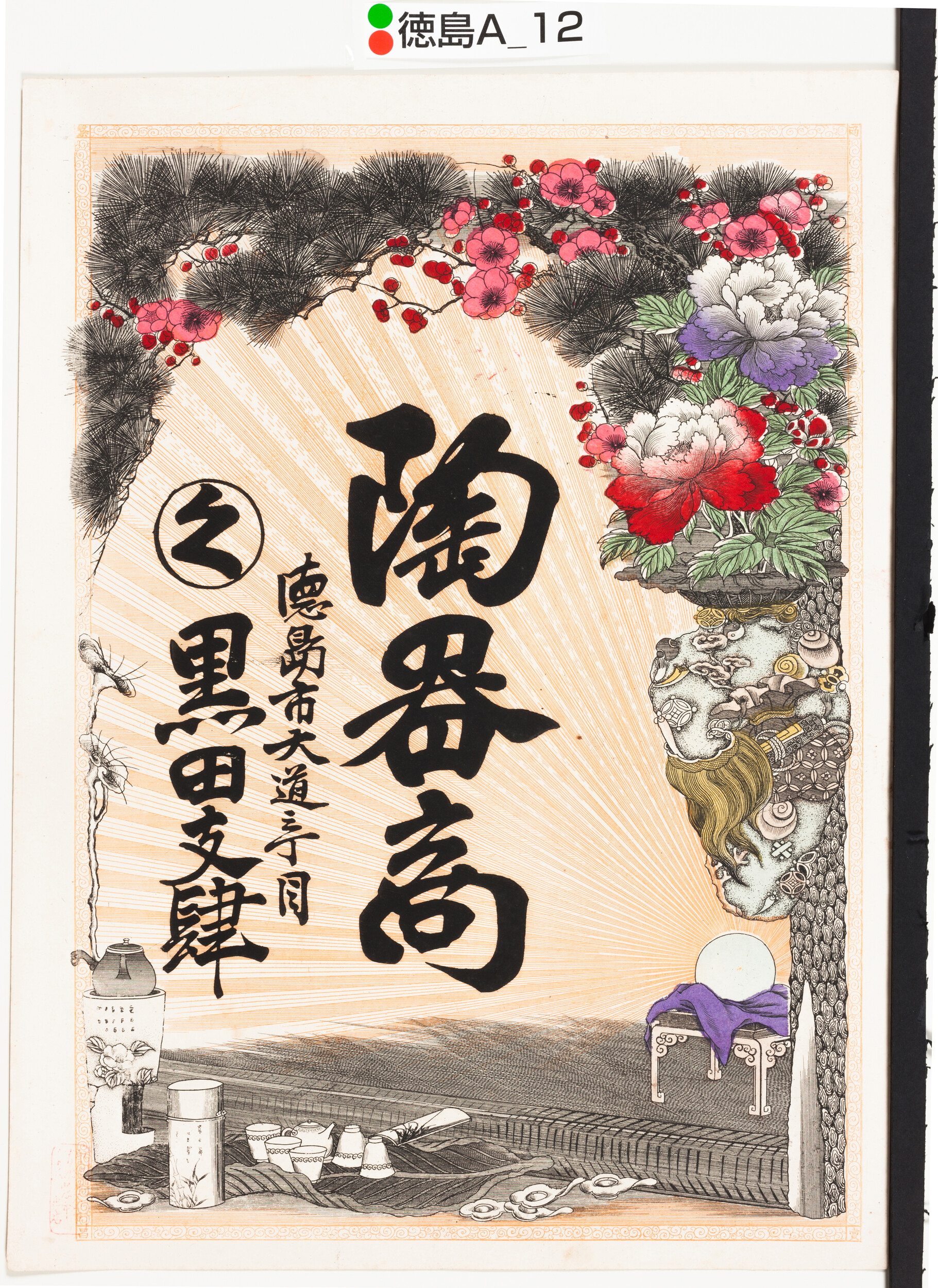 引札絵柄:花枠 下部茶器 商店場所:徳島市大道3丁目 商店名称:黒田支店 商売内容:陶器商