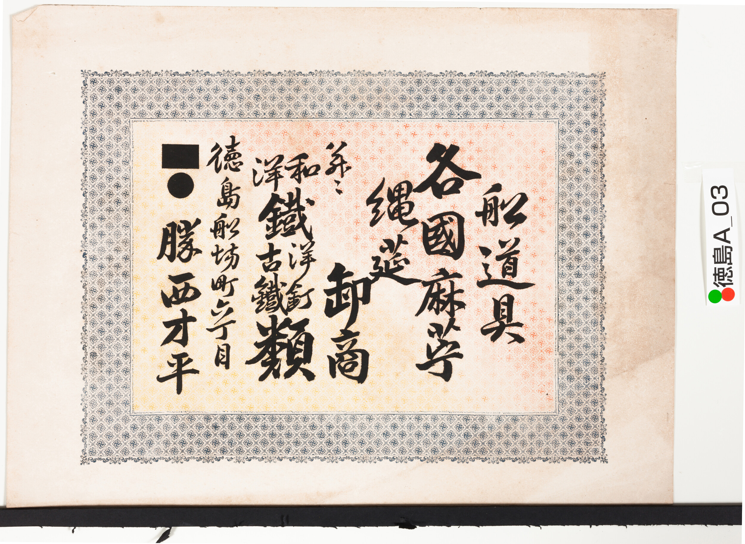 引札絵柄:船道具 各国麻苧 縄筵卸商 并ニ和洋鐡 洋釘 古鐡類 枠内に広告文字のみ 商店場所:徳島船場町6丁目 商店名称:勝西才平 商売内容:船道具 各国麻苧 縄筵卸商