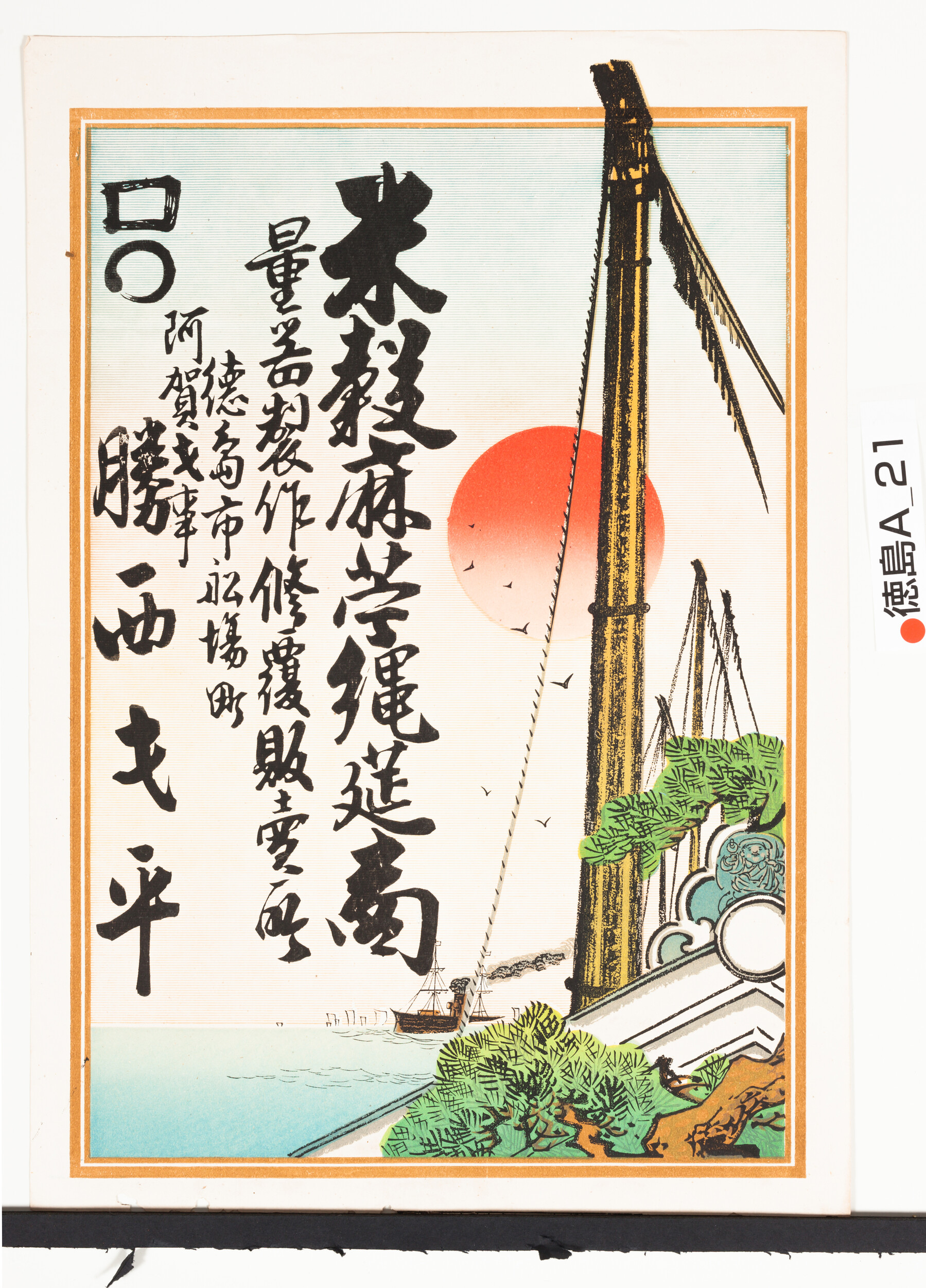引札絵柄:瓦屋根の向こうに望む海 朝日 松商店場所:徳島船場町 商店名称:阿賀才事 勝西才平 商売内容:米穀麻苧縄筵商 量器制作修復販売所