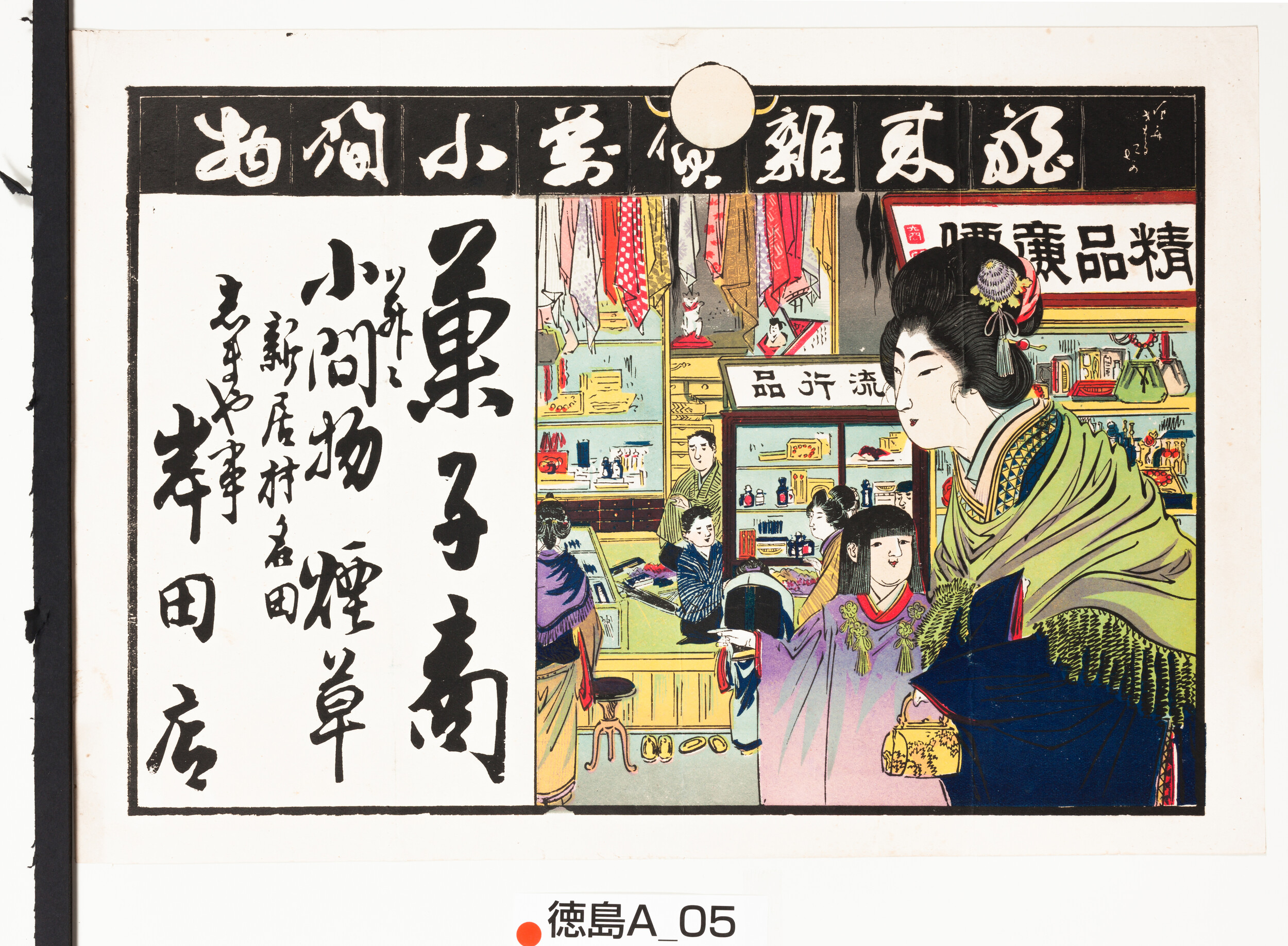 引札絵柄:店先で子どもの指さす方を見る母 店内に「舶来雑貨」「流行品」「精品廉価」などの看板文字が見える 商店場所:新居村名田 商店名称:志まや事 岸田店 商売内容:菓子商并ニ小間物煙草