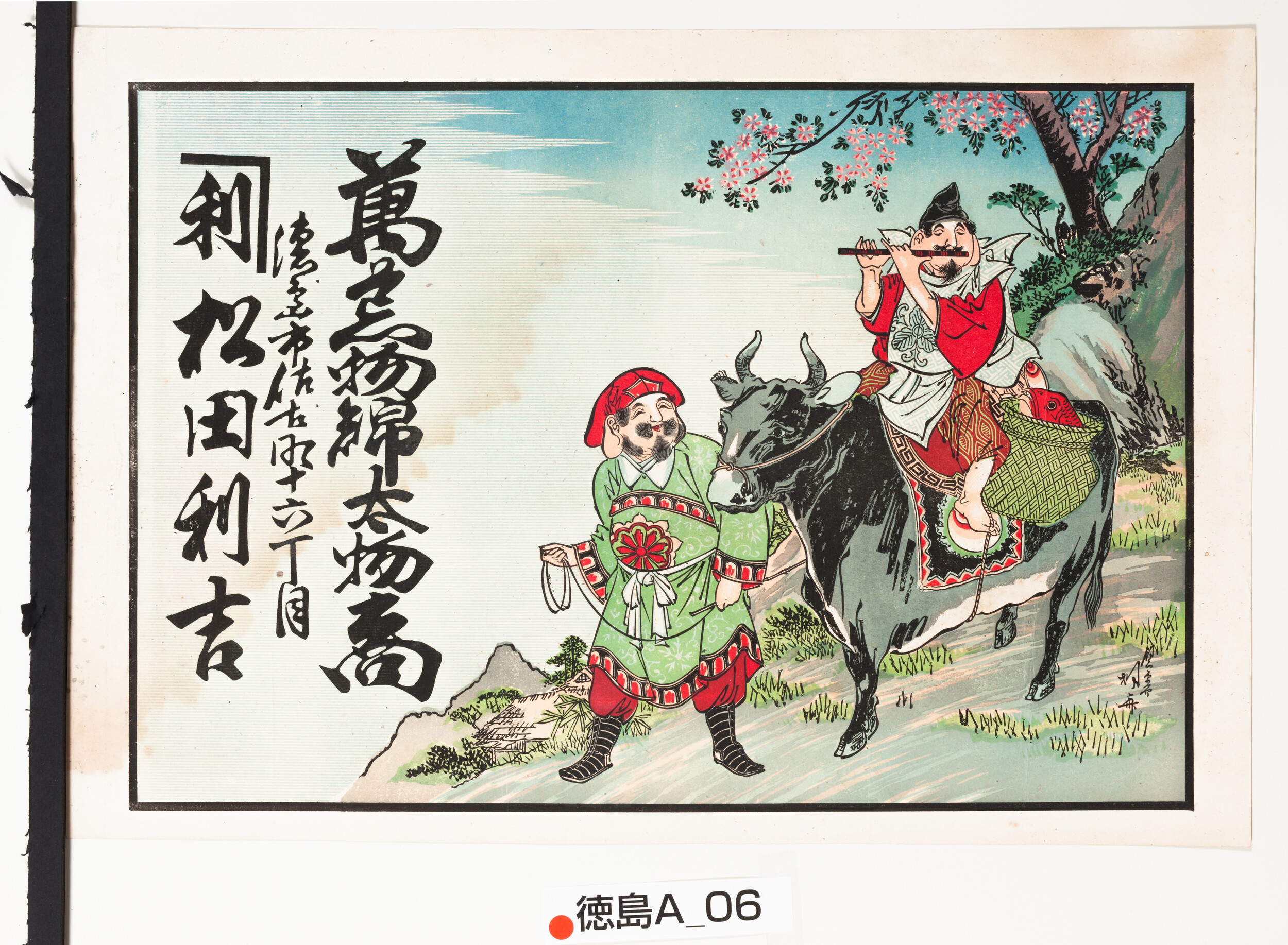 引札絵柄:大黒に引かれた牛の上で笛を吹く恵比寿 商店場所:徳島市佐古町16丁目 商店名称:号 松田利吉 商売内容:萬荒物綿太物商