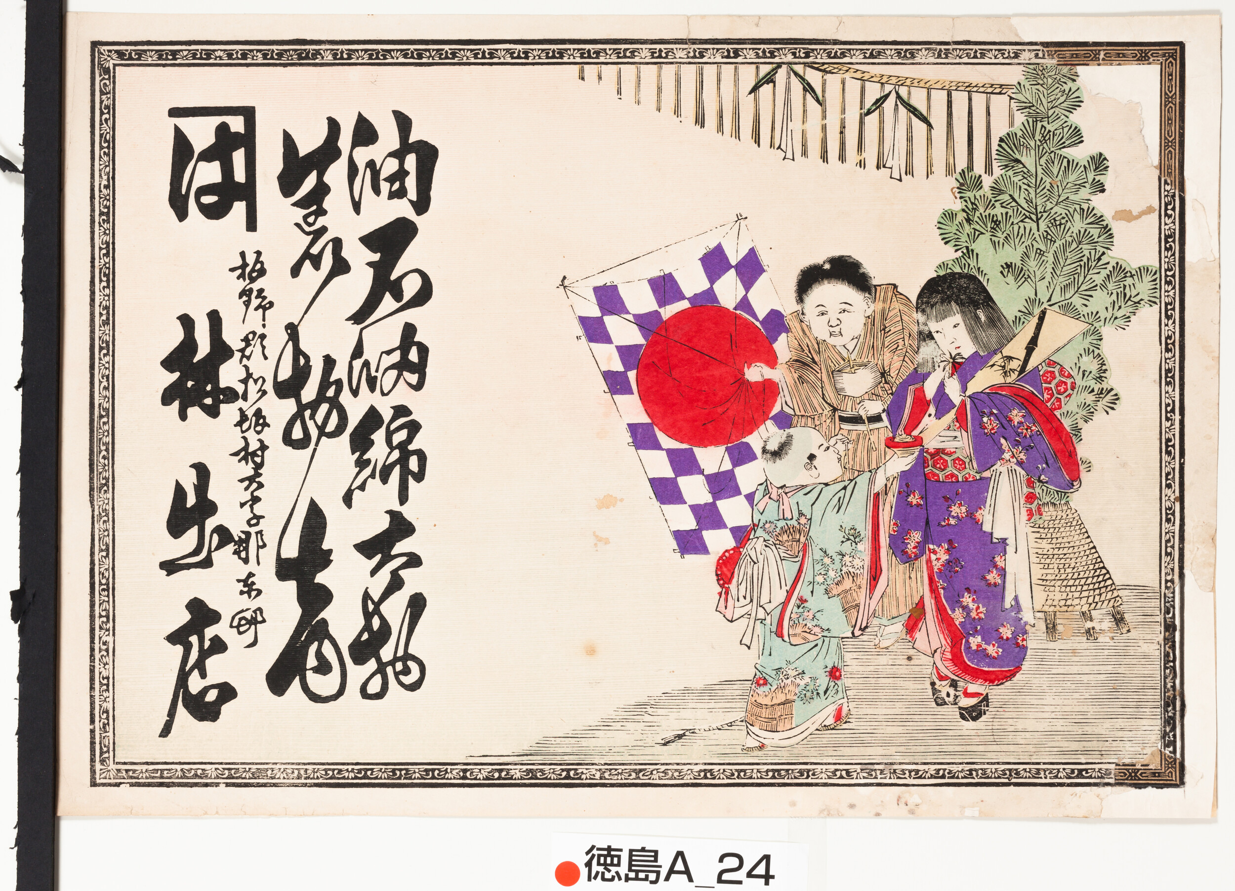 引札絵柄:門松の前で羽子板や凧を持つ子ども達 商店場所:板野郡松坂村大字那東邨 商店名称:号 林出店 商売内容:油石油綿太物製物商