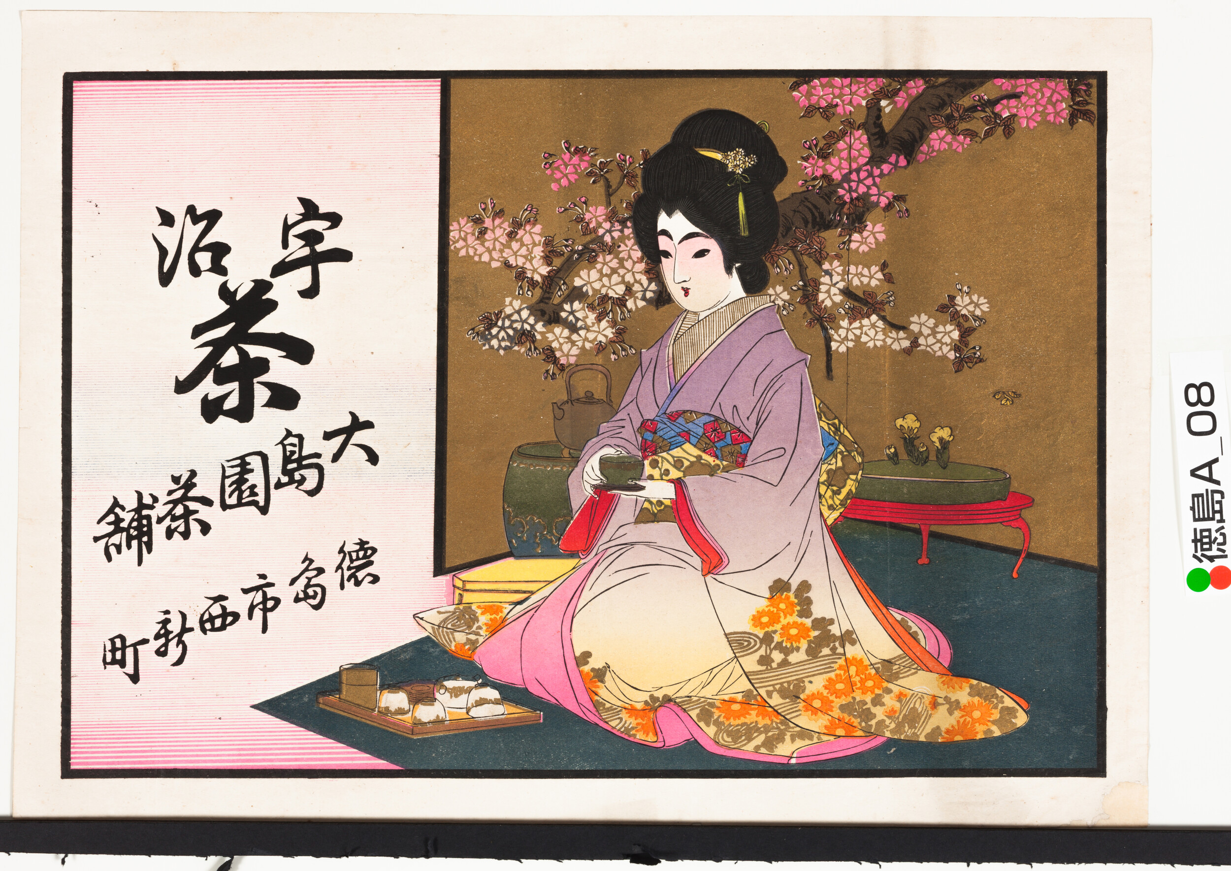 引札絵柄:両手でお茶を持つ女人 商店場所:徳島市西新町 商店名称:大島園茶舗 商売内容:宇治茶