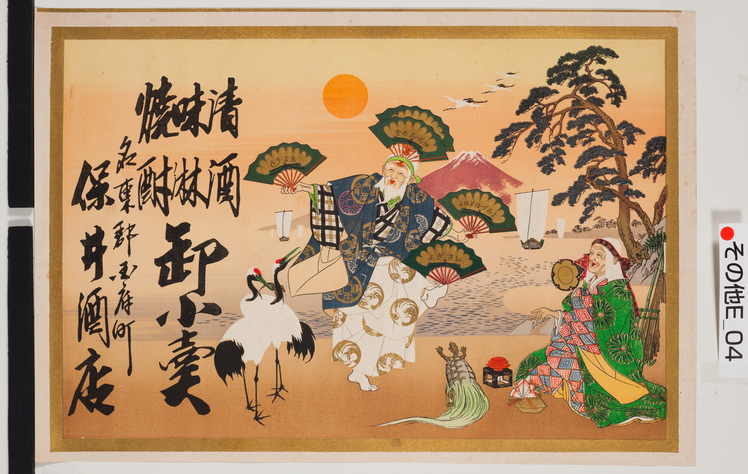引札絵柄:朝日 鶴亀 鼓を叩く姥と複数の扇を持って踊る翁 商店場所:名東郡国府町 商店名称:保井酒店 商売内容:清酒 味醂 焼酎卸小売