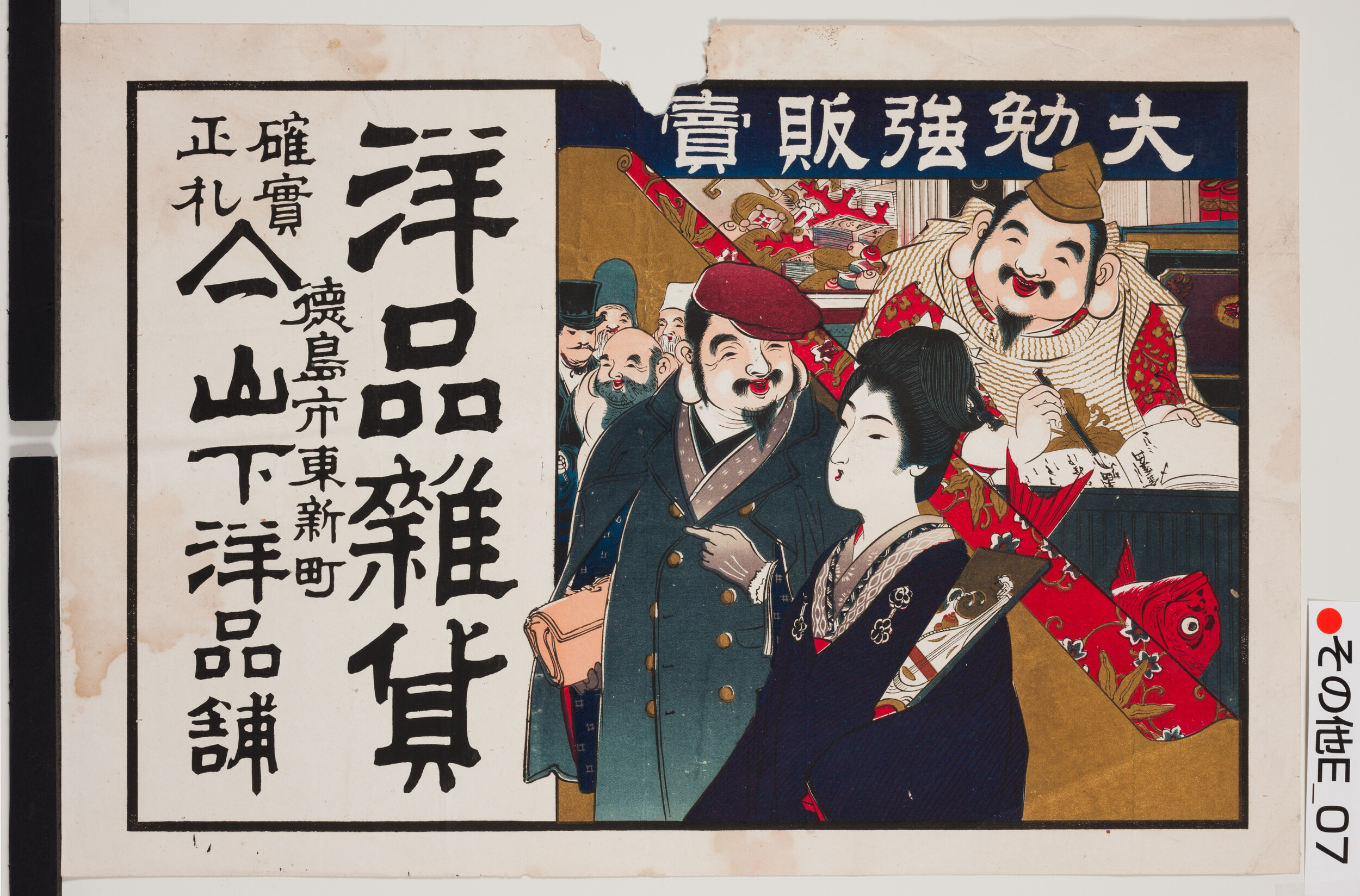 引札絵柄:大勉強販売 買い物をする男女 商店場所:徳島市東新町 商店名称:号 山下洋品舗 商売内容:洋品雑貨