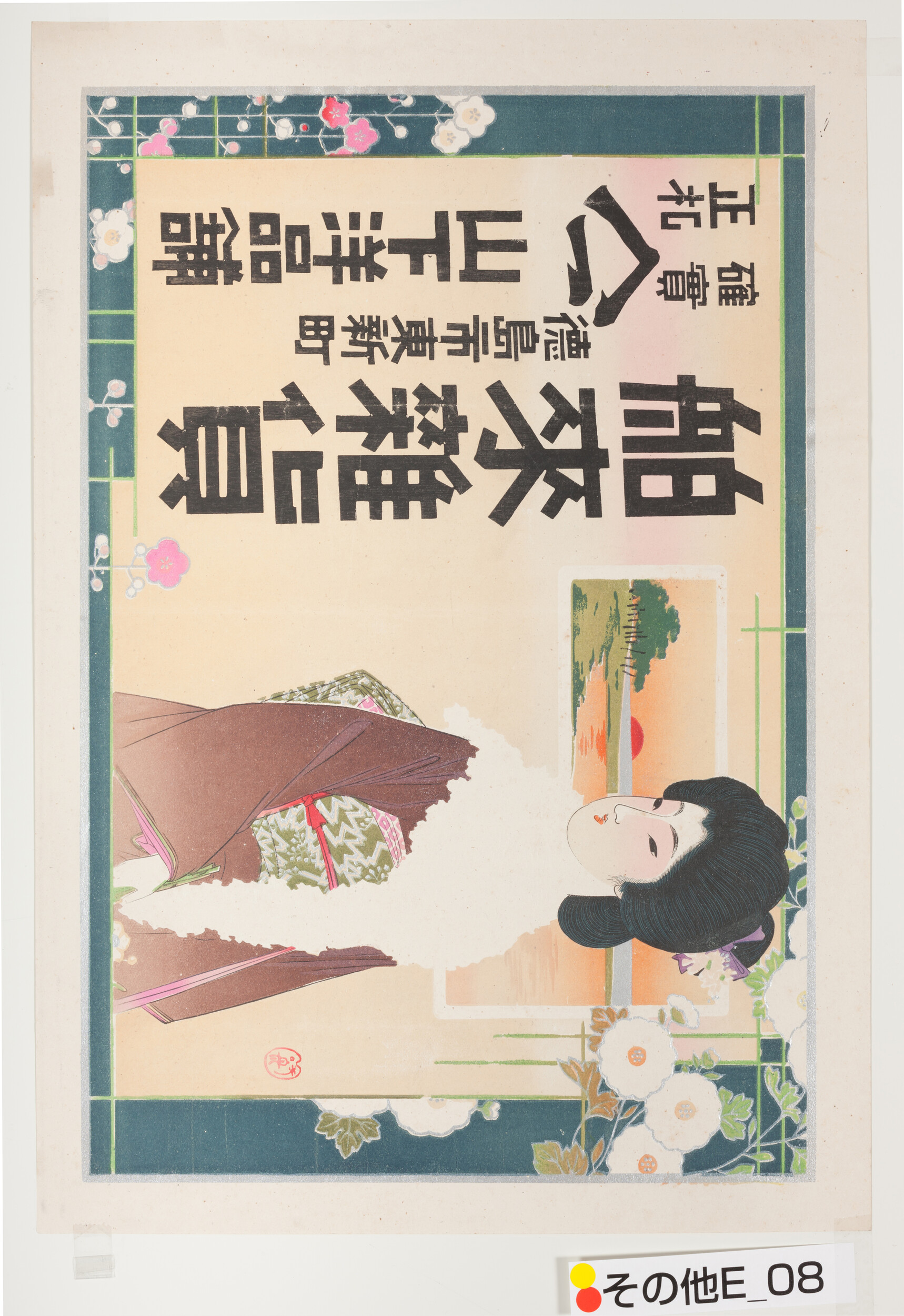 引札絵柄:ショールを巻いた美人 商店場所:徳島市東新町 商店名称:号 山下洋品舗 商売内容:舶来雑貨