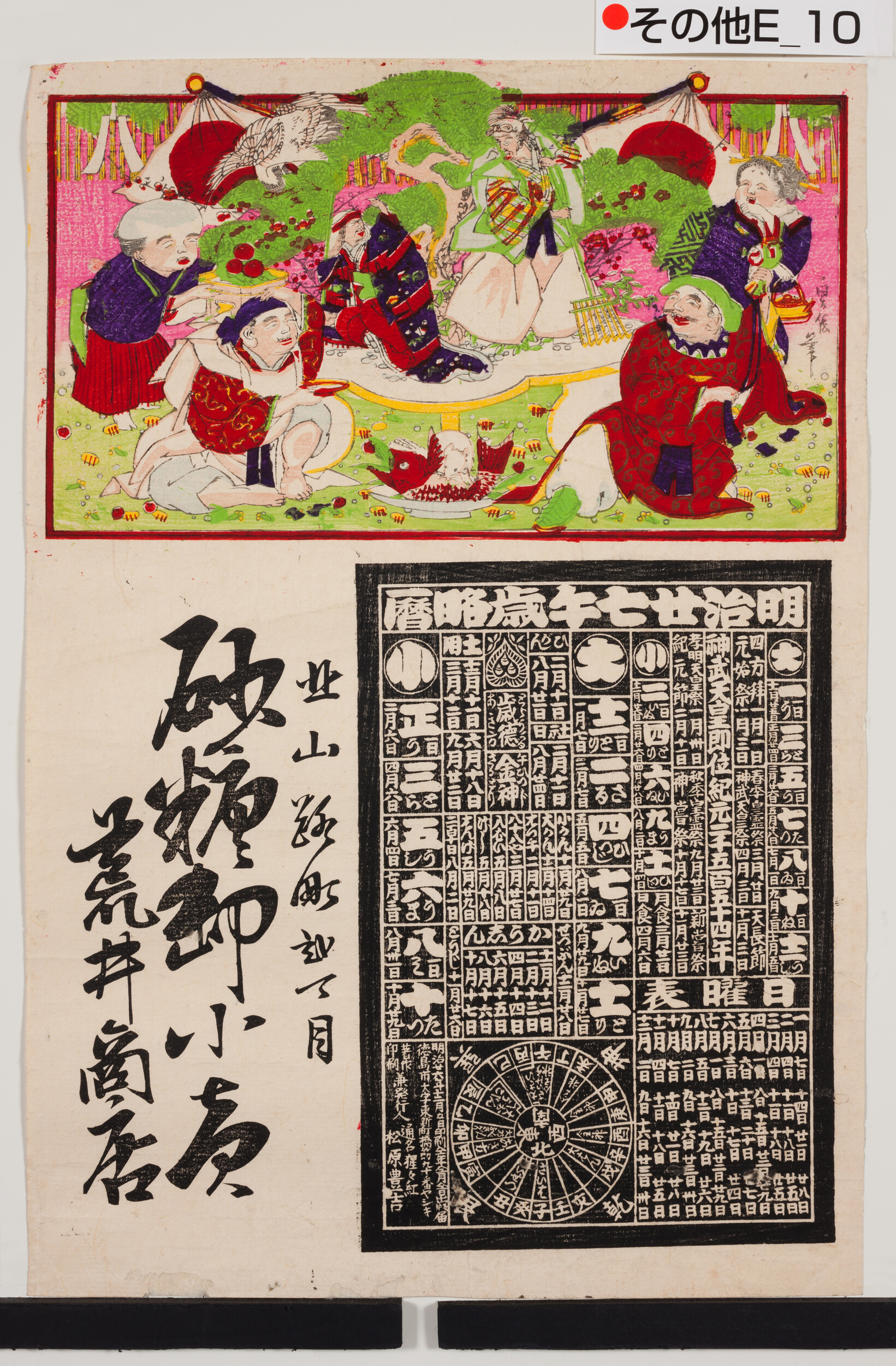 引札暦:寿老人・お多福・福助・恵比須・大黒明治27年午歳略歴 商店場所:北山路町2丁目 商店名称:荒井商店 商売内容:砂糖卸小売