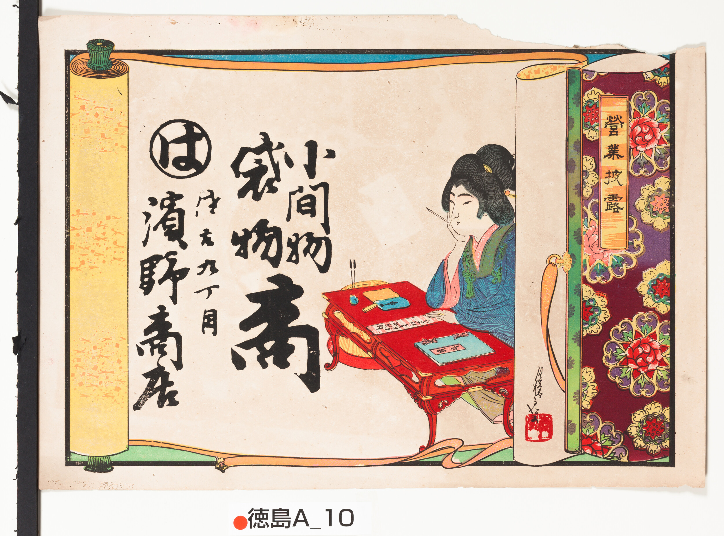 引札絵柄:題「営業披露」巻物風 商店場所:佐古九丁目 商店名称:浜野商店 商売内容:小間物・袋物商